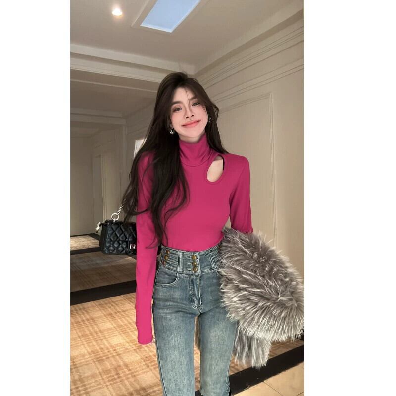 襟インナー中空ボトミングシャツ女性の秋と冬の新しいスリムフィット起毛長袖 Tシャツアメリカンショートトップ ロング オータム 秋物 ウィンター 冬物 nana26806691203 | modepoisson