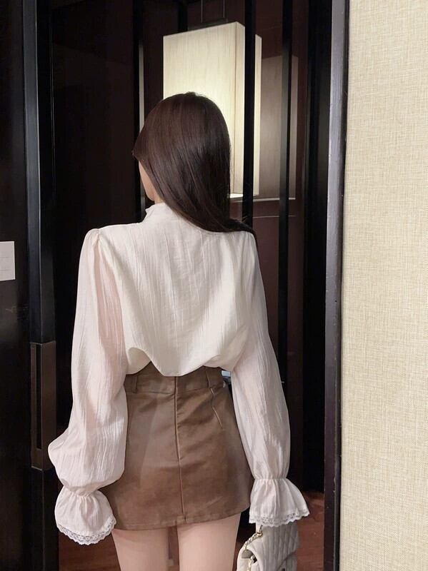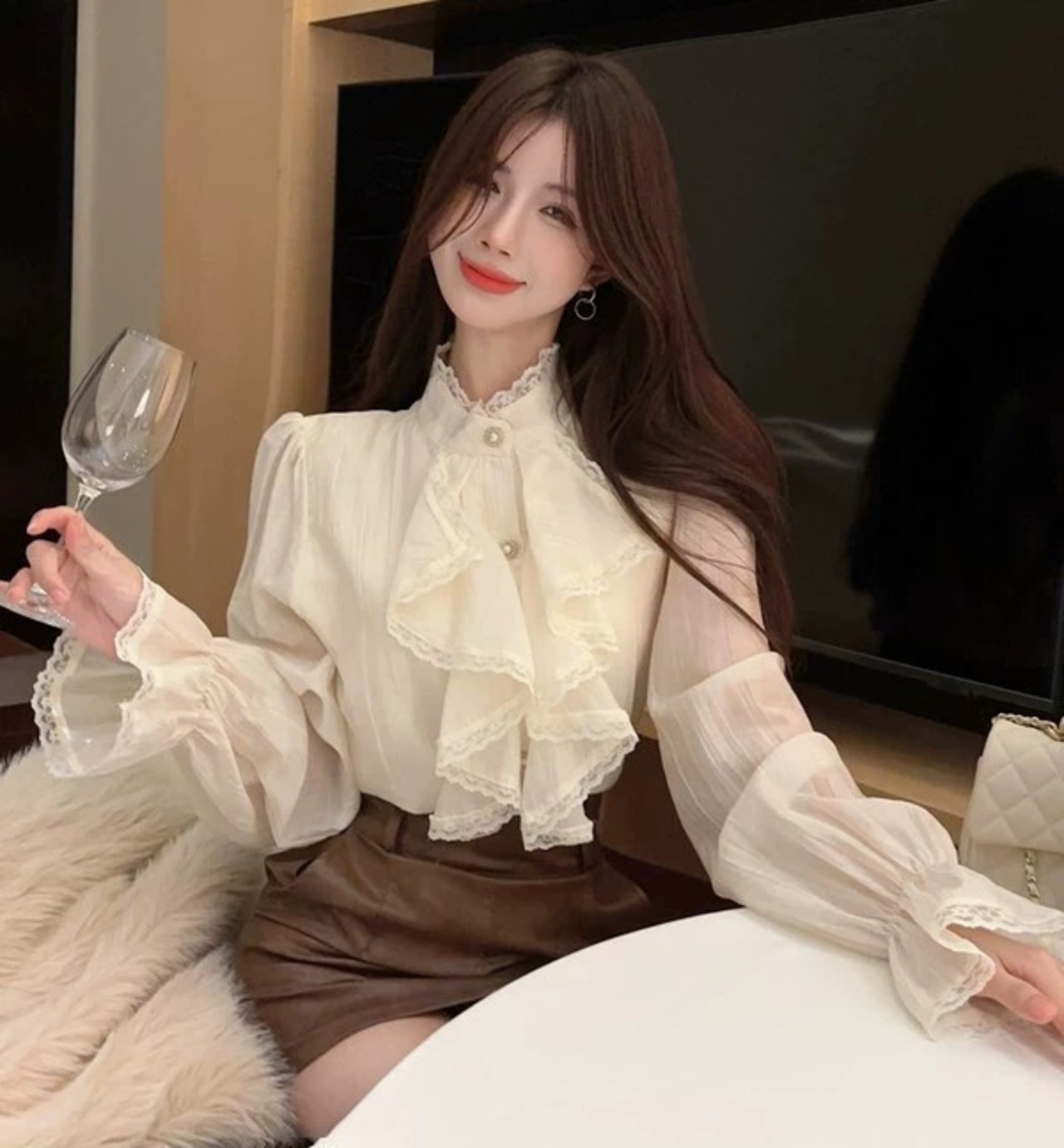 フレンチフリル宮殿スタイルシャツスリムフィットニッチデザイン女性の秋と冬の新しい長袖ベルベットトップ ロング レース オータム 秋物 ウィンター 冬物 nana81655466180 | modepoisson