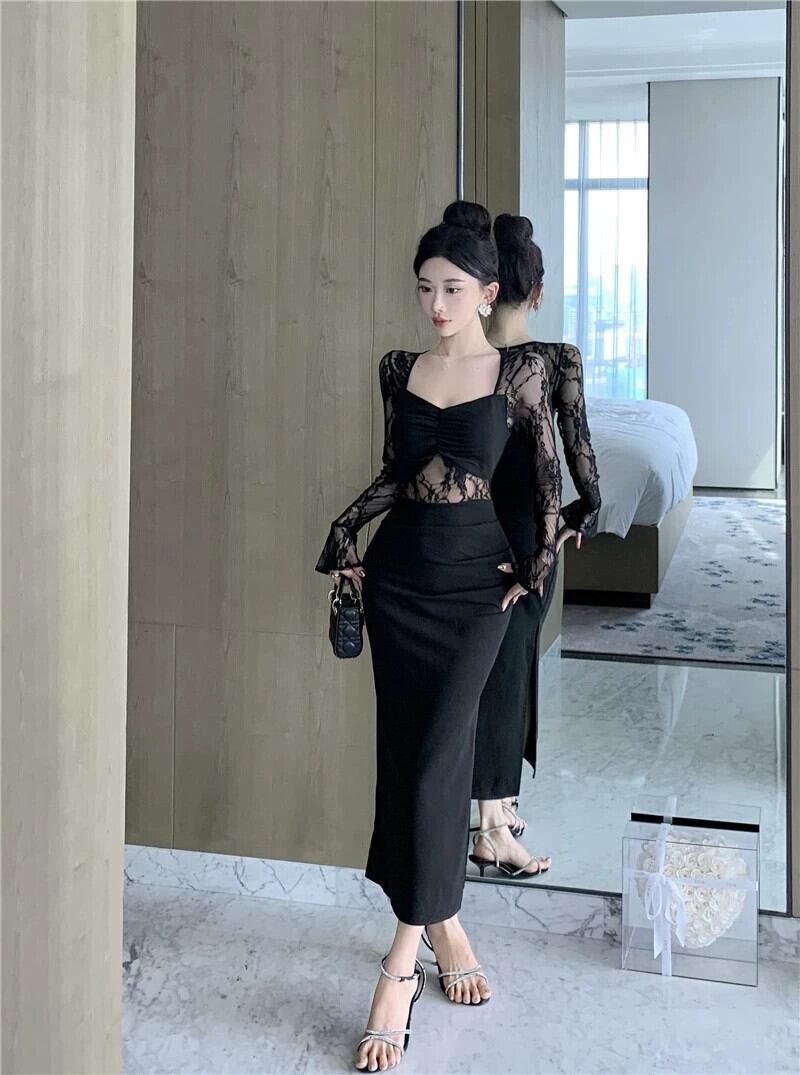ナナ〜フレンチレトロライトラグジュアリースタイルレースレディスプライシングセクシーなヒップハグロングスカートスリットドレス女性の冬 ウィンター 冬物 nana88999390287 | modepoisson