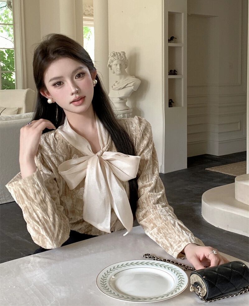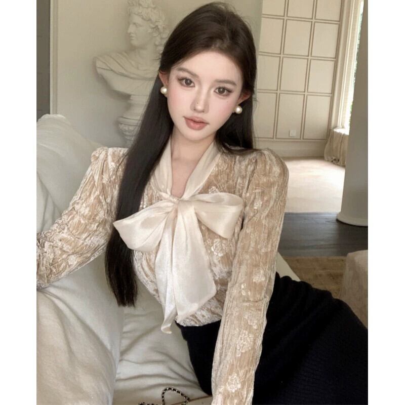 -エンド気質シャツレディース秋冬フレンチデザインニッチスプライシングゴールドベルベットボトムシャツ長袖トップ ロング オータム 秋物 ウィンター 冬物 nana59783670324 | modepoisson