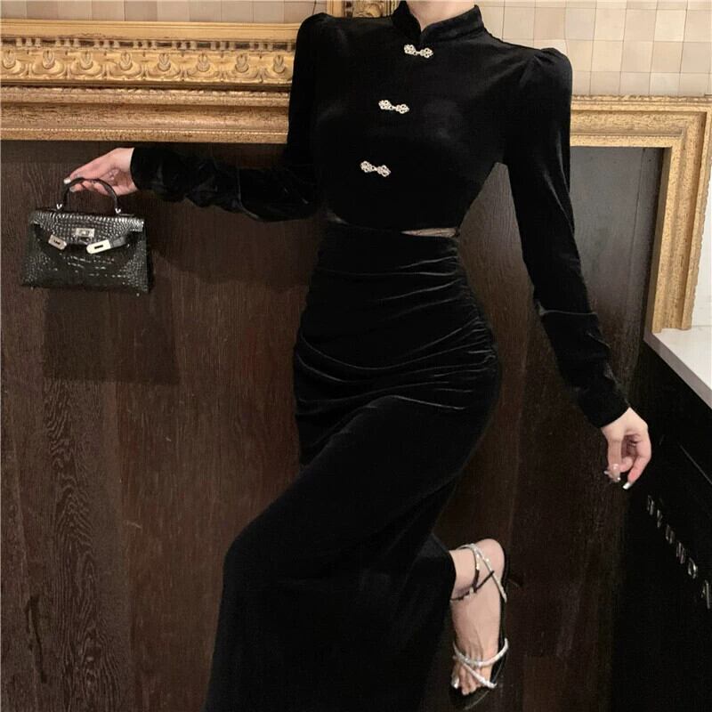 中国風の改良されたベルベットのチャイナドレス、ハイエンドの黒の底、カジュアルなウエストとヒップのスカートの女性、秋と冬 ブラック オータム 秋物 ウィンター 冬物 nana24572387517 | modepoisson