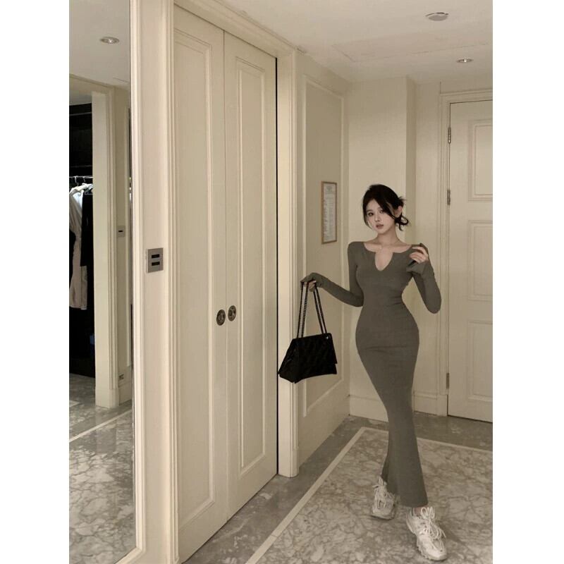 秋冬インナーワンピース、フェミニンなVネック長袖着痩せスカート、新作ウエスト絞りセクシーヒップカバーロングスカート オータム 秋物 ウィンター 冬物 nana35691084652 | modepoisson