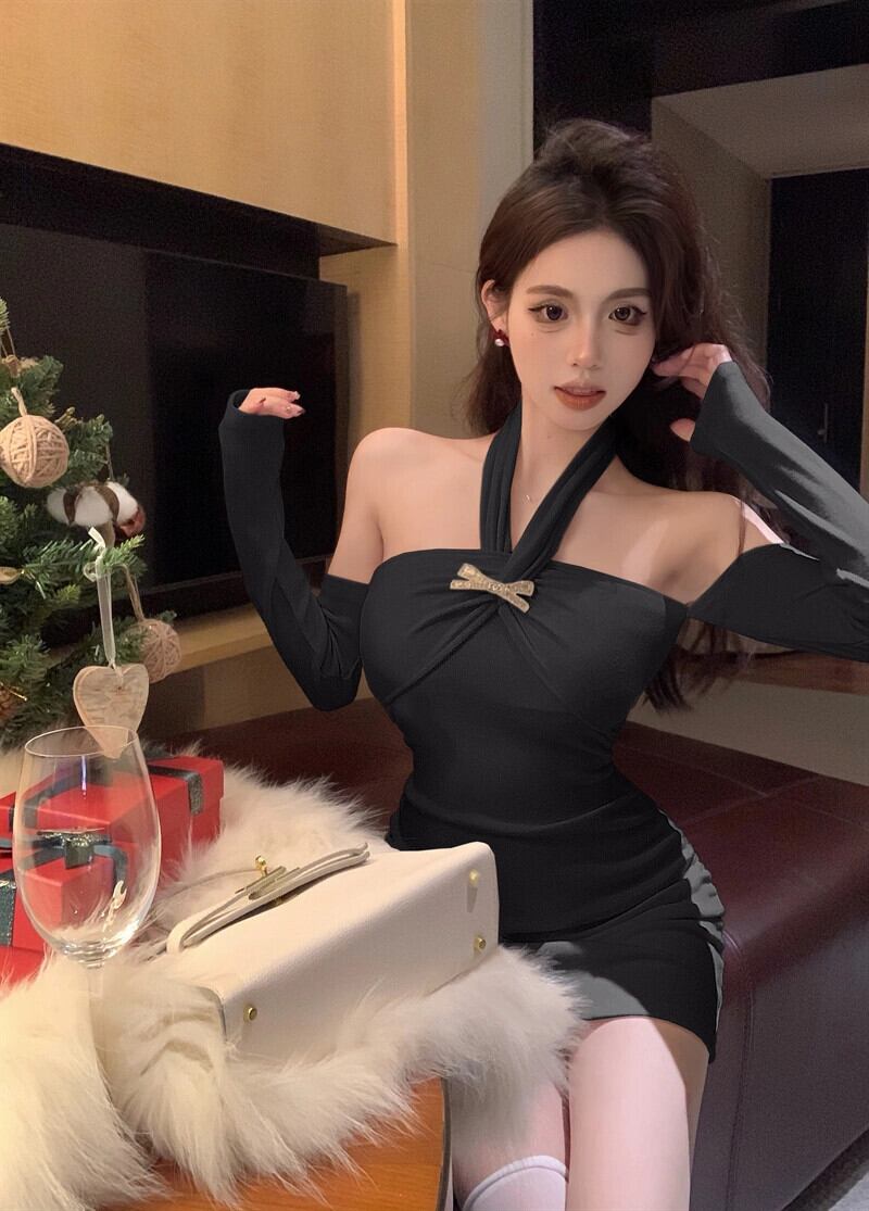 気質ホルターネックスリムサスペンダードレス女性秋と冬の小人、甘くてセクシーなセクシーなヒップ抱きショートスカート痩身 大人ガーリー スウィート キュート カジュアル オータム 秋物 ウィンター 冬物 nana44527642579 | modepoisson
