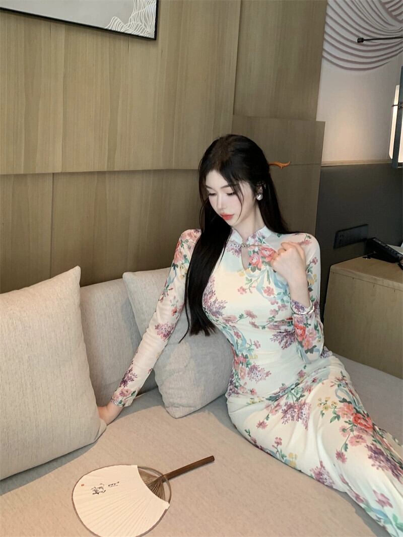 プリントチャイナドレス女性の秋と冬の新しい中国風中国風のインナーヒップスカートスリムスリムミドル丈スカート オータム 秋物 ウィンター 冬物 nana57773721242 | modepoisson