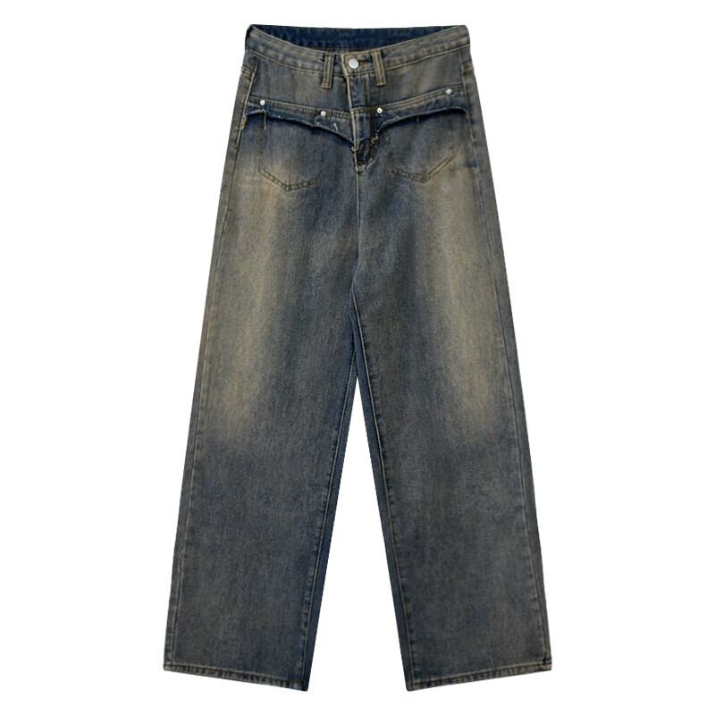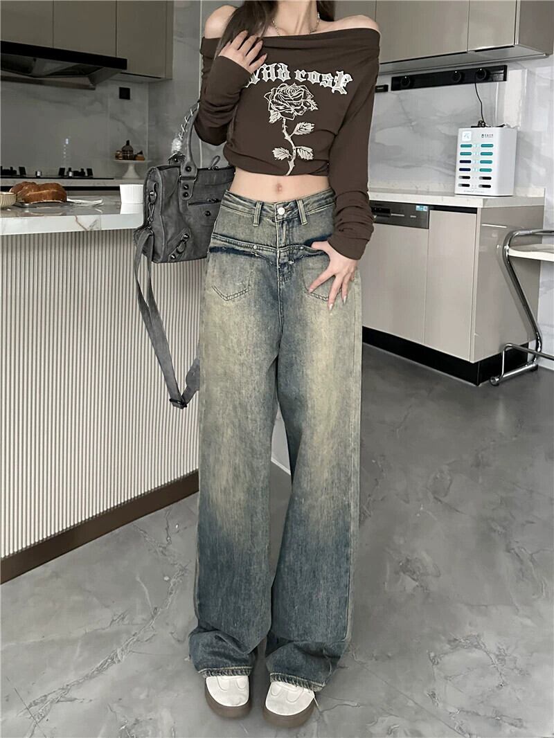 レトロダメージウォッシュジーンズ女性春と秋 2024 新しいアメリカンハイウエストカジュアルルーズストレートワイドレッグパンツ スプリング 春物 オータム 秋物 nana57745988166 | modepoisson