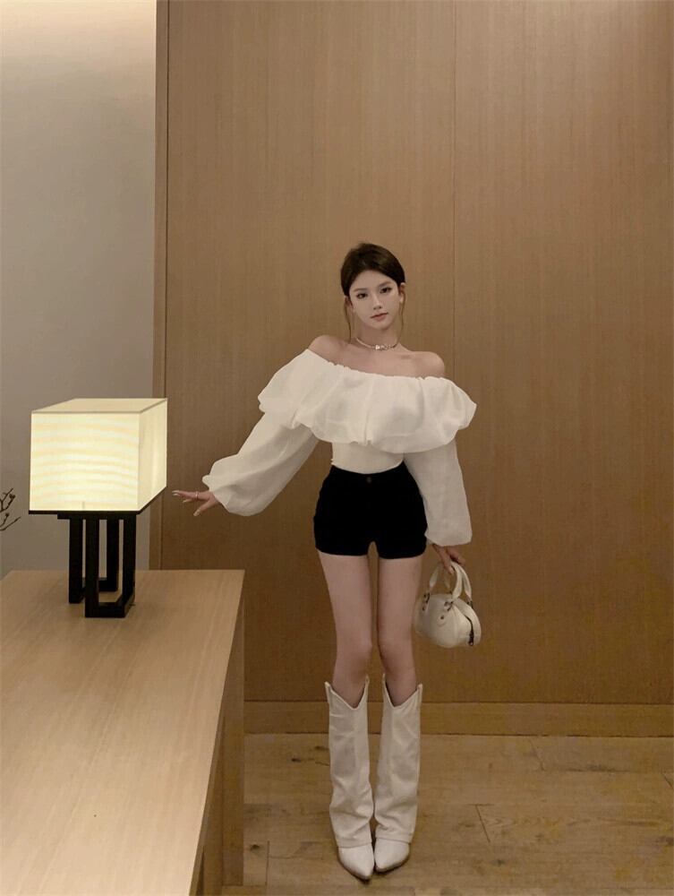 セクシーなワンショルダーパフスリーブスーパーフェアリーシフォンシャツ女性の秋と冬のフレンチウエスト長袖トップ白い底シャツ ロング ホワイト オータム 秋物 ウィンター 冬物 nana54996205020 | modepoisson