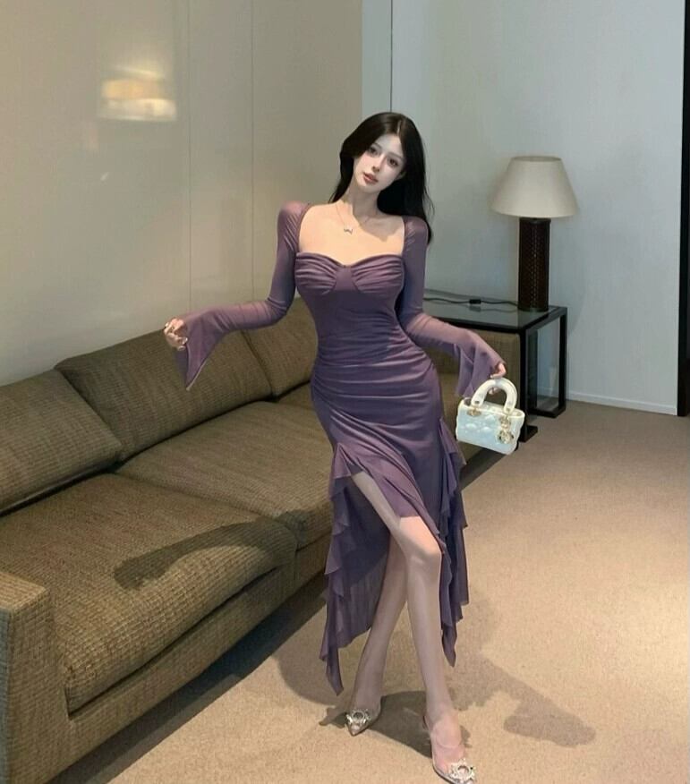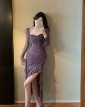 ホットスクエアネック長袖ドレス女性の春の気質重工業ハイエンドスカートフリルスプライシングスリットロングスカート スプリング 春物 スクウェア nana86403966652 | modepoisson