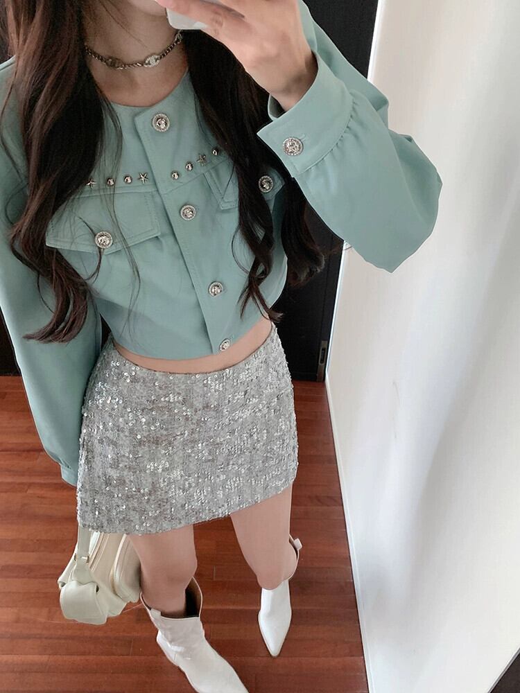 色:ライトブルーのレザージャケット,シルバースカート