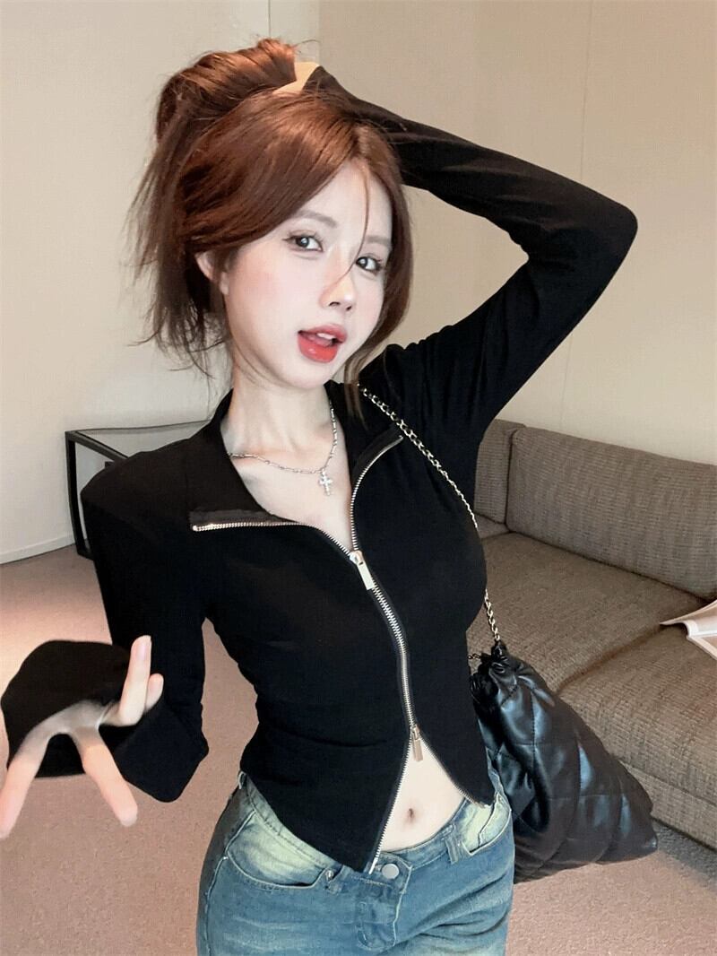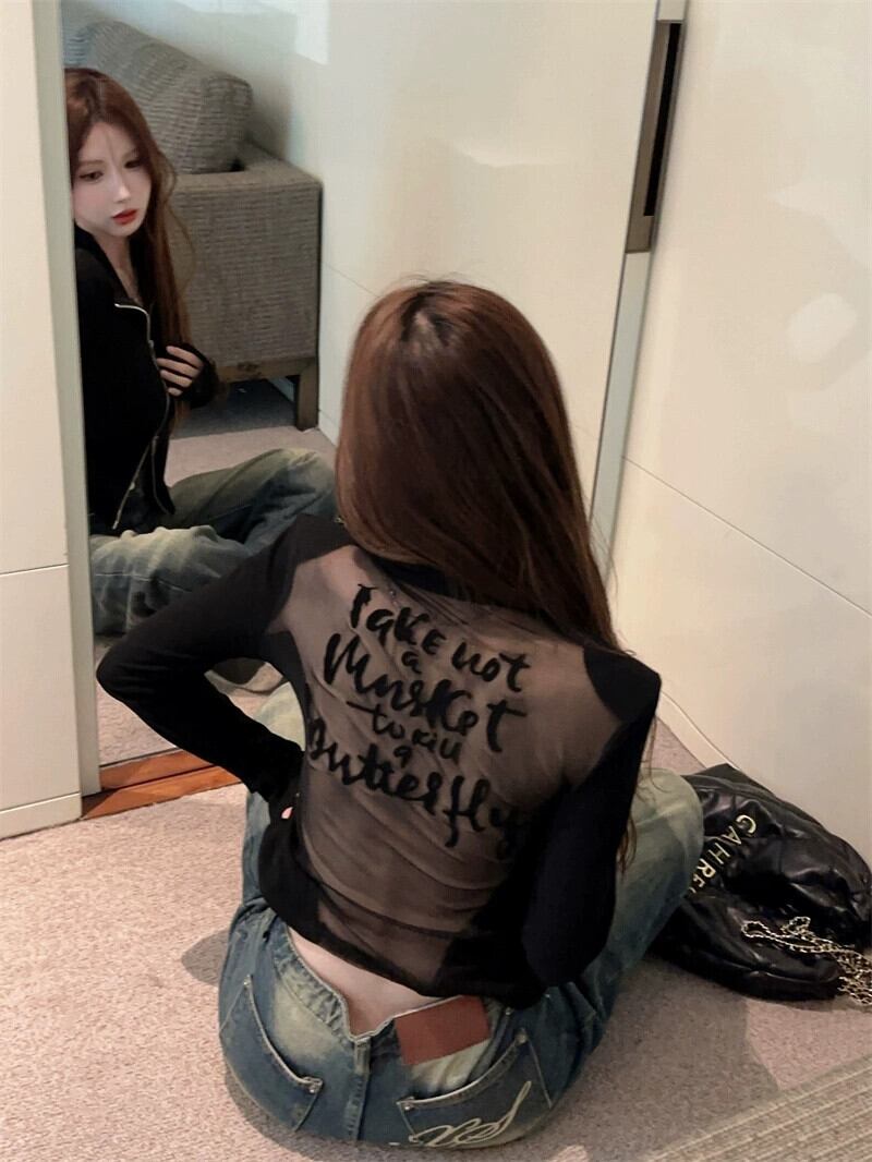 甘いバックメッシュ長袖 Tシャツの女性の秋冬シースルー厚手の文字プリントスリムショートカーディガントップ ロング 大人ガーリー スウィート キュート カジュアル オータム 秋物 ウィンター 冬物 nana10706791412 | modepoisson