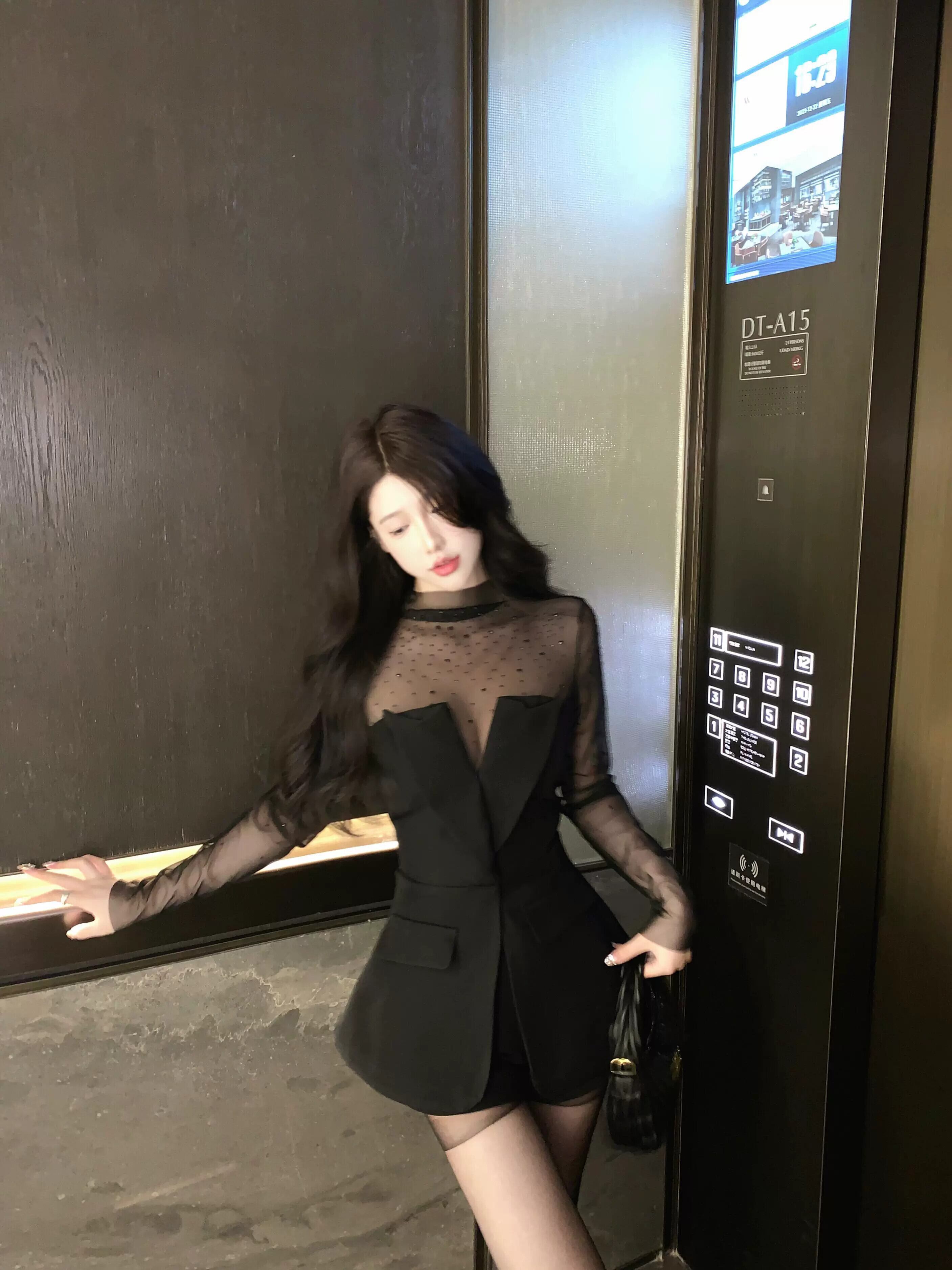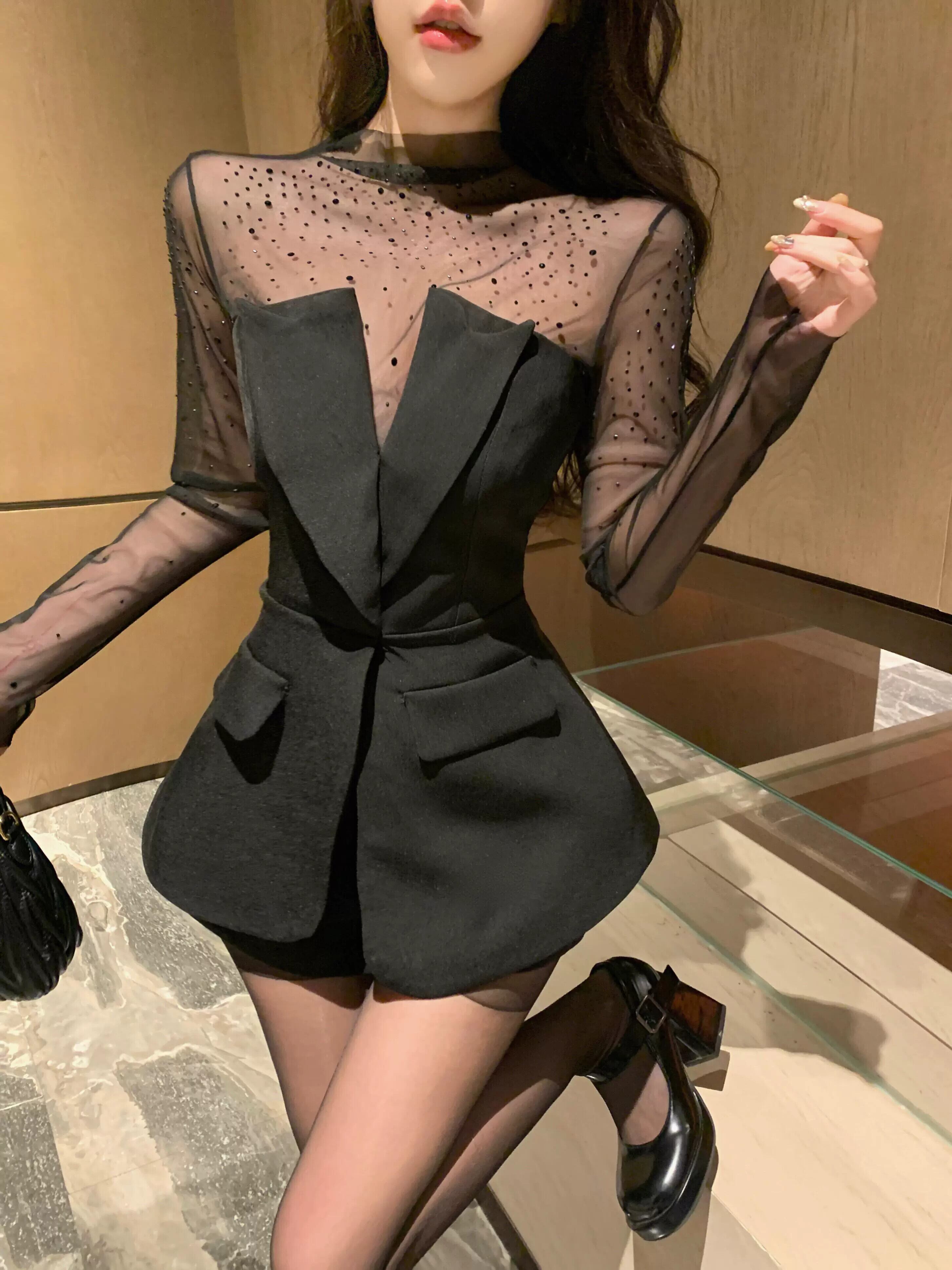 純粋な欲望メッシュダイヤモンド長袖 Tシャツ女性ネクタイスーツチューブトップ気質レディトップ秋冬 2 点セット ロング オータム 秋物 ウィンター 冬物 nana29227220413 | modepoisson