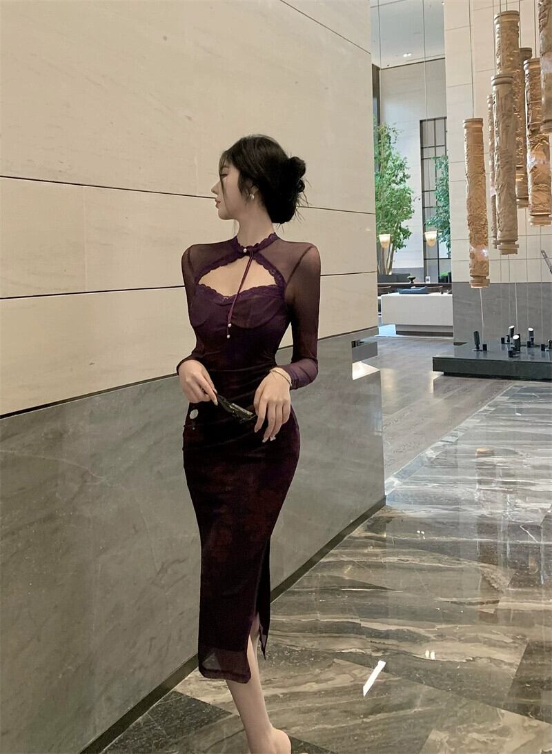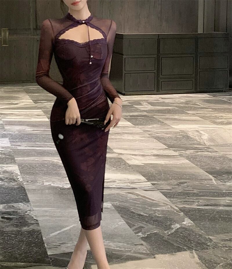 秋冬のミッドレングスのエレガントなドレスの女性紫メッシュステッチハイエンドのレトロなプリント中国風のチャイナドレススカート オータム 秋物 ウィンター 冬物 パープル nana3196010068 | modepoisson