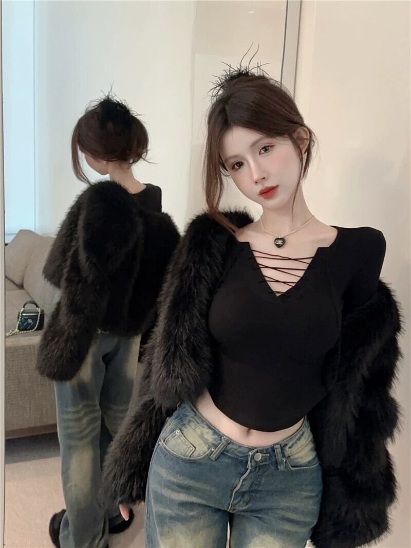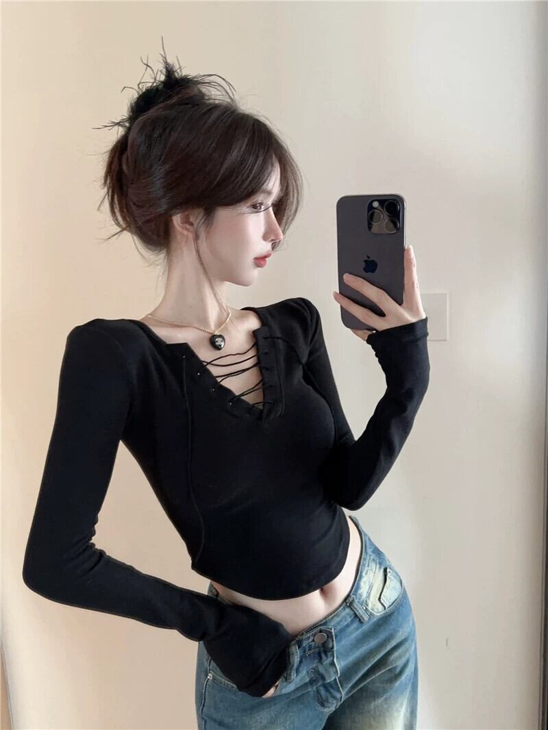 長袖 Tシャツ純粋な欲望スタイルストラップスリムフィットボトリングシャツ女性初春の新しい重工業ニッチショートトップ ロング スプリング 春物 ピュア nana774378650 | modepoisson