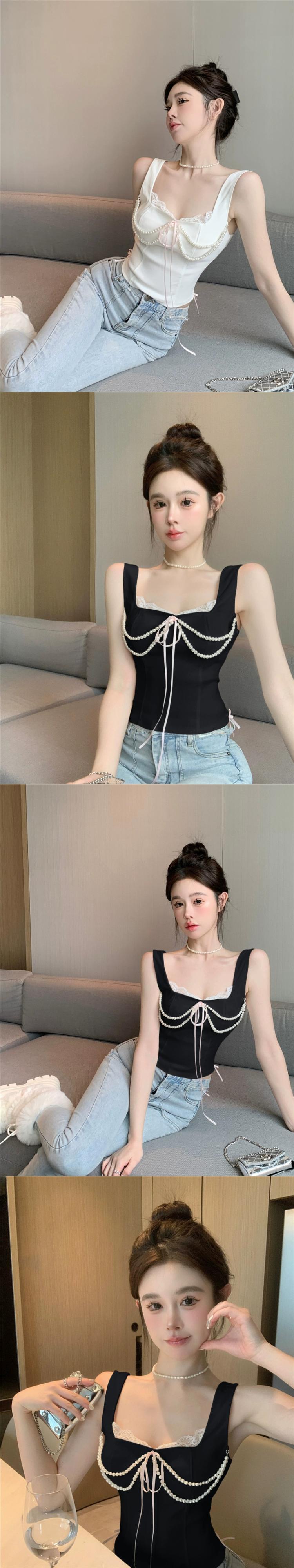 フランスの純粋な欲望スタイルのキャミソール女性、レースステッチとパール、ハイエンドのウエストを細くするボトムス、ノースリーブトップ ピュア 真珠 nana58576977694 | modepoisson