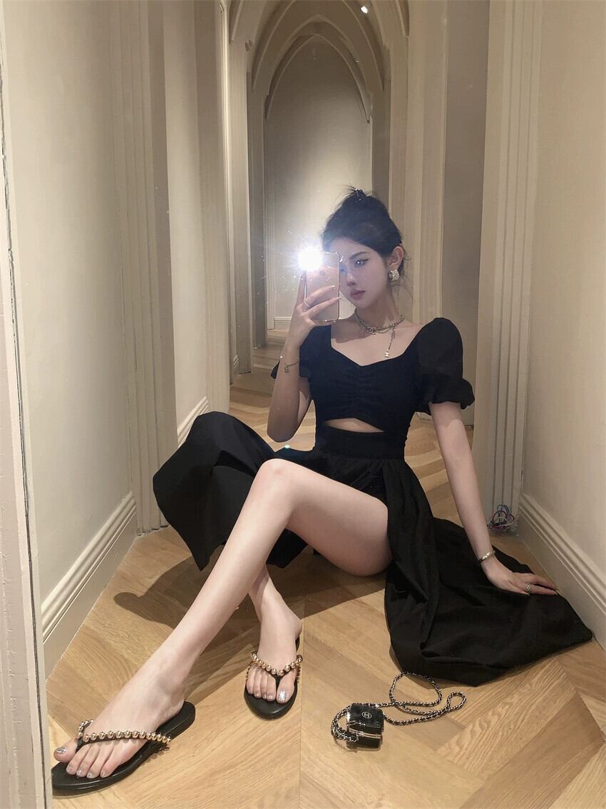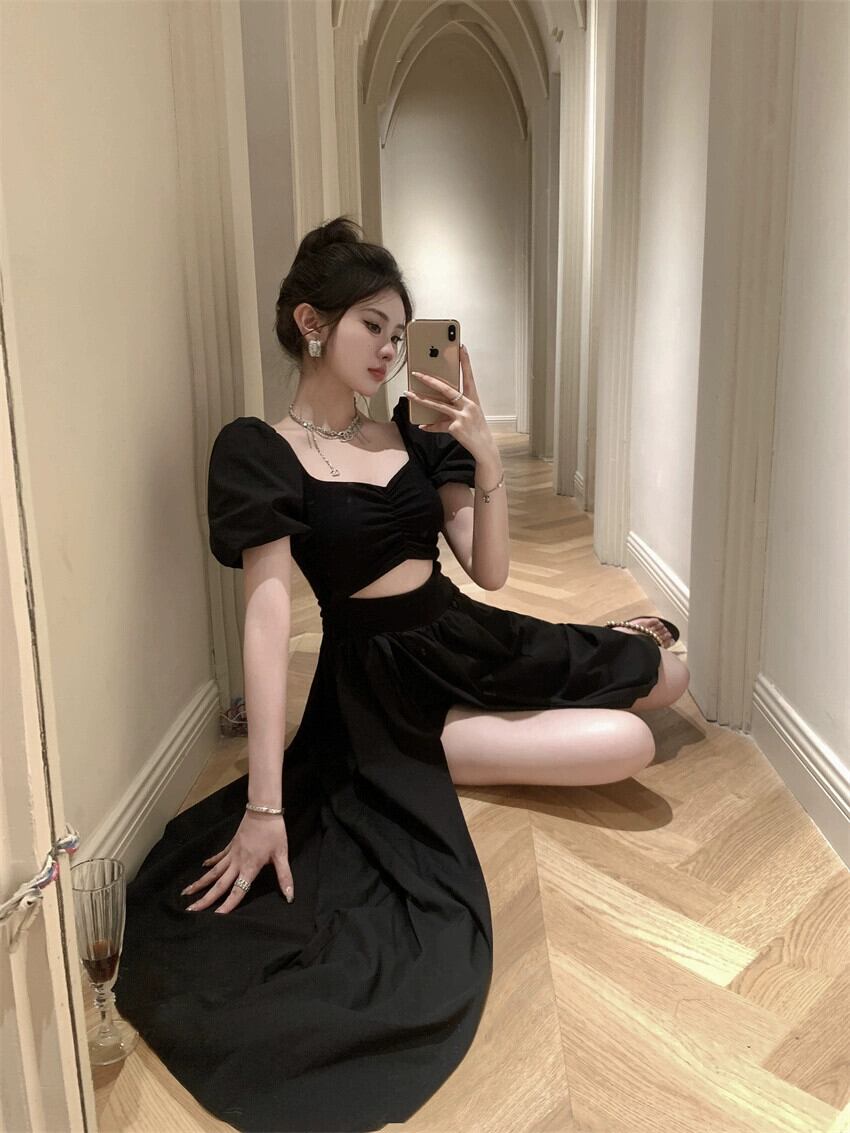 黒のスクエアネック半袖スリムドレスニッチレディース夏人気フレンチスタイルロングスカート ショート ブラック ハーフスリーブ サマー 夏物 スクウェア nana11327668631 | modepoisson