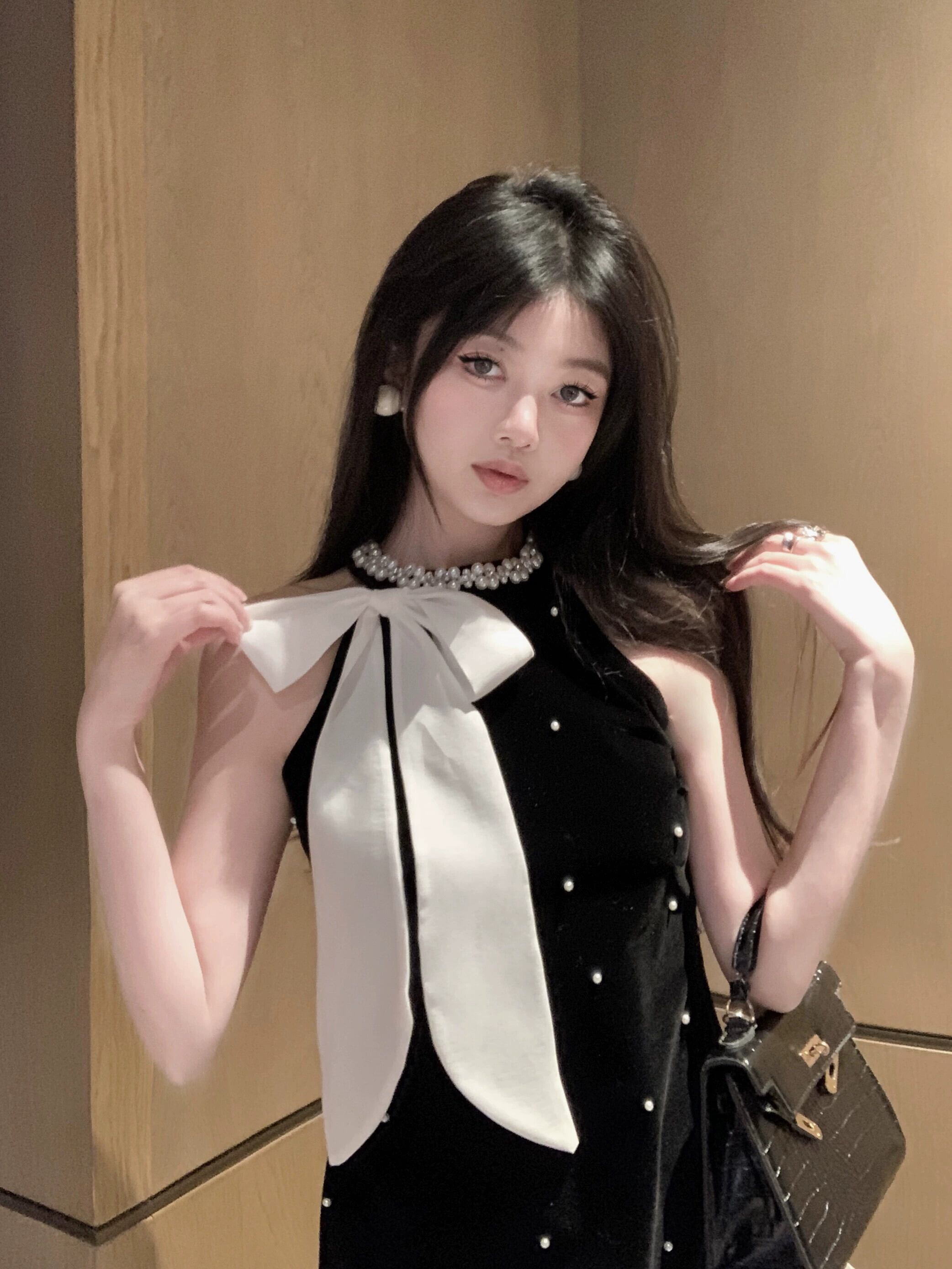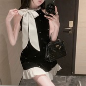 蝶ネクタイホルターネック黒サスペンダードレスルーズ痩身女性の秋と冬のウエストAラインスカート新しいボトリングスカート ブラック オータム 秋物 ウィンター 冬物 nana51368116525 | modepoisson