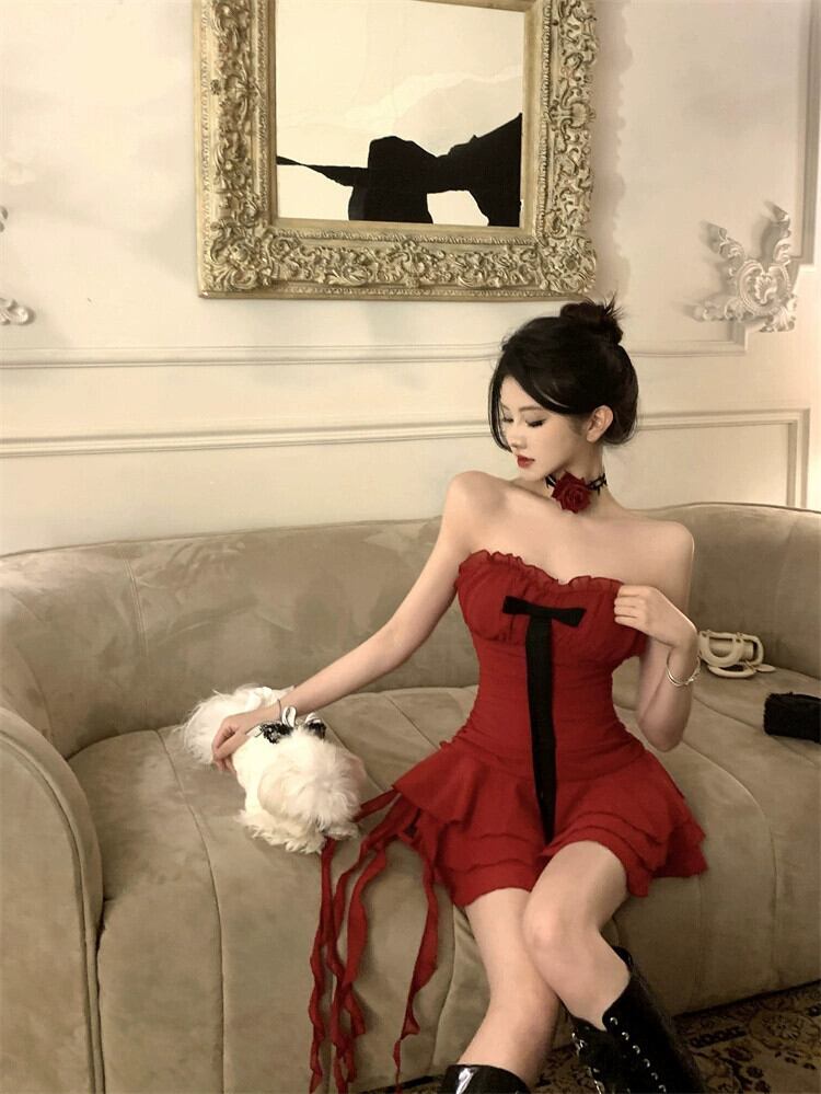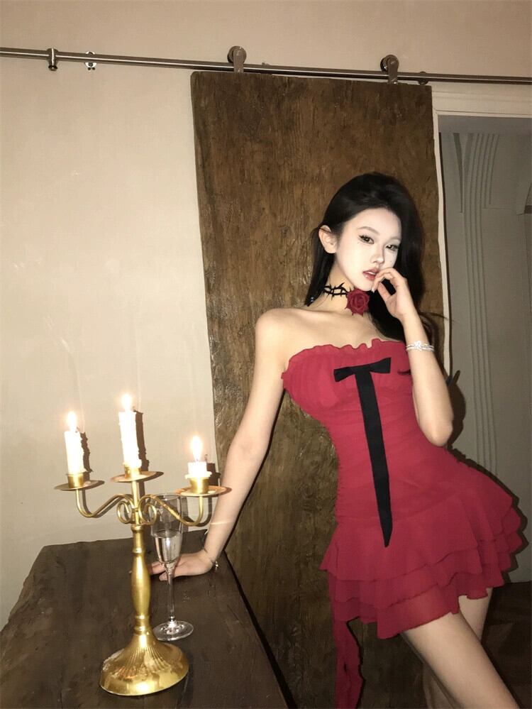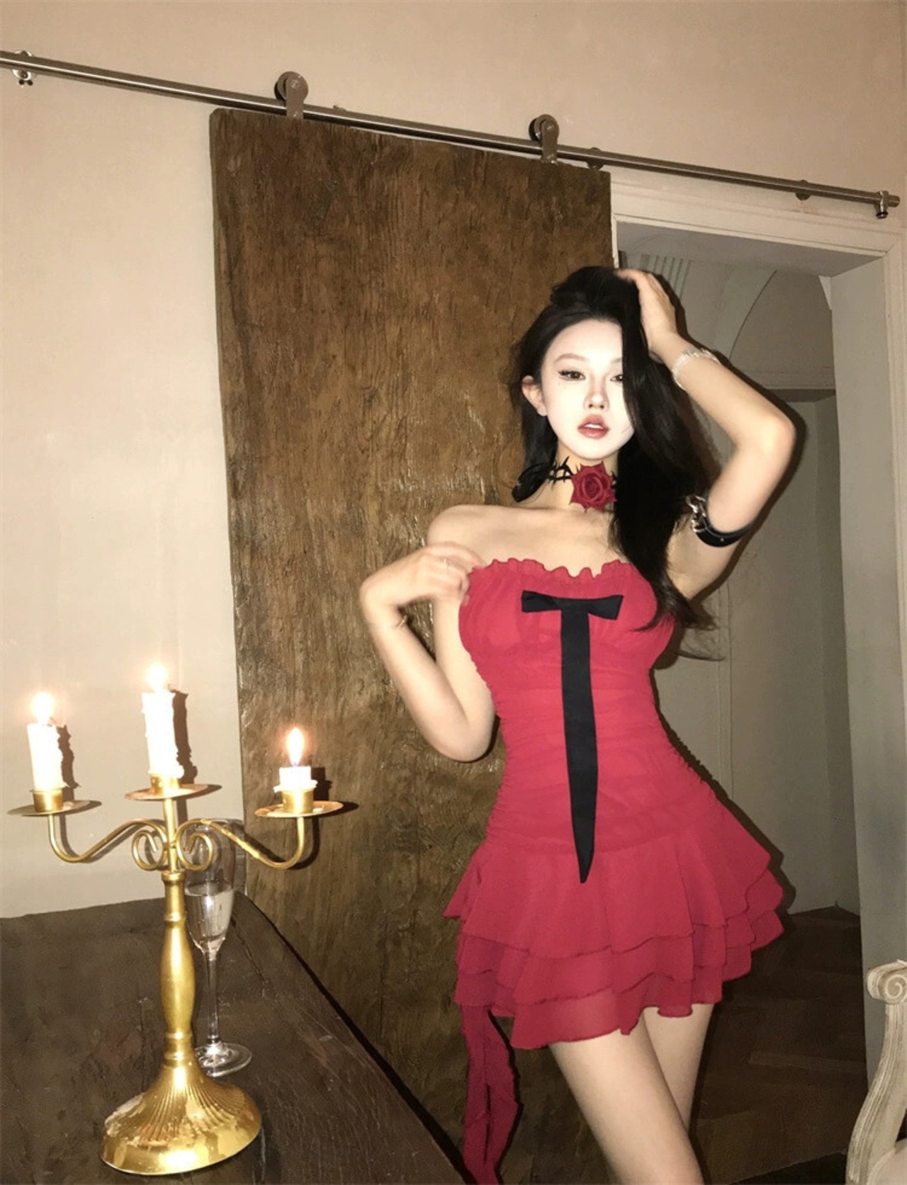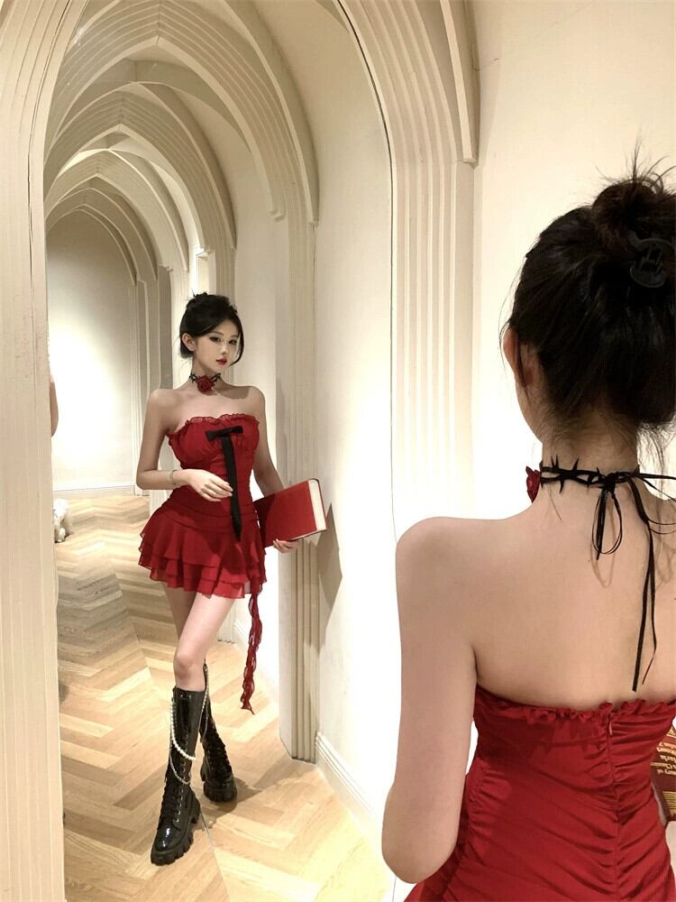 赤いチューブトップシフォンドレス女性の夏の新しい純粋な欲望セクシーなケーキスカート痩身スリム気質ショートスカート レッド サマー 夏物 ピュア nana97664655581 | modepoisson