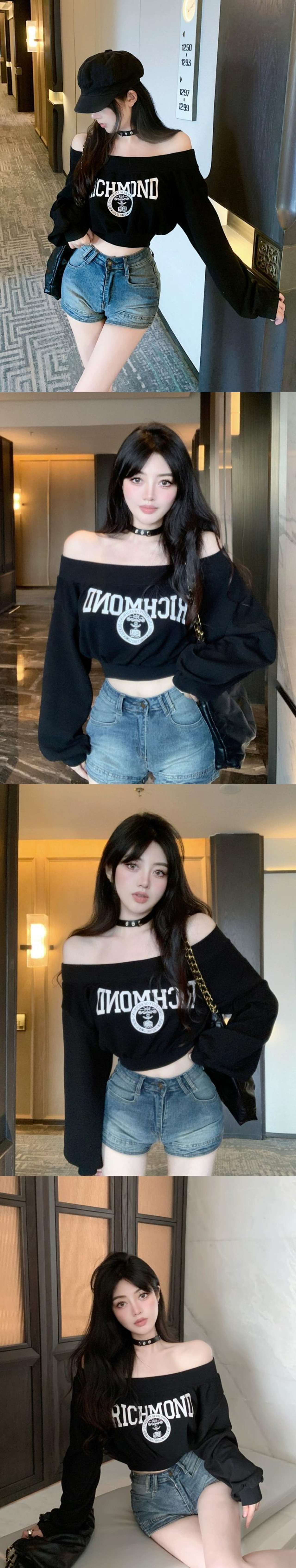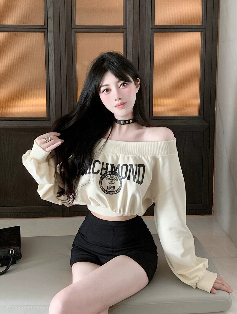 怠惰なスタイルのルーズでスリムなレタースウェットシャツの女性の春と秋の新しいニッチ長袖ワンラインカラーオフショルダーショートトップ ロング スプリング 春物 オータム 秋物 nana7800258275 | modepoisson