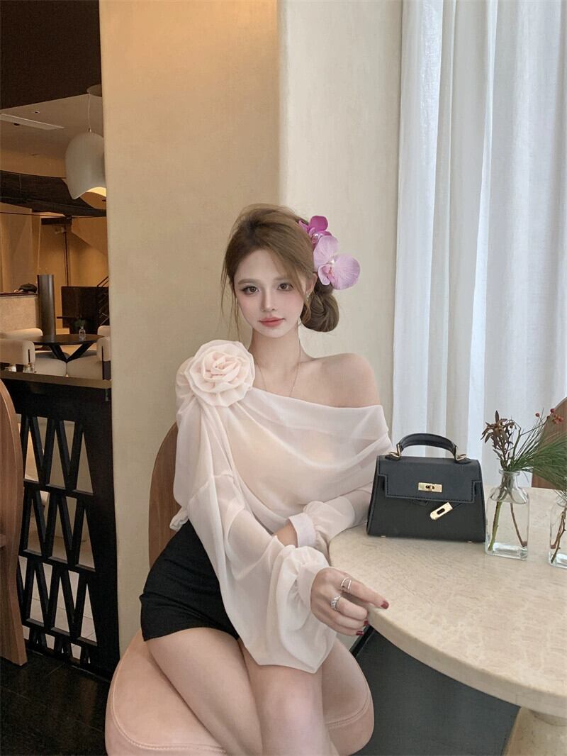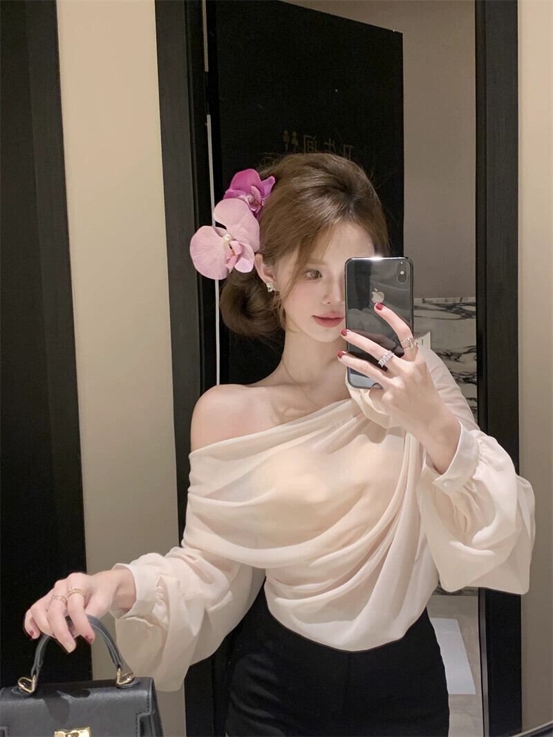 長袖Tシャツ、早春のデザイン、ニッチなオフショルダーのフランスの薄いスタイル、新しいシックで甘い、スパイシーで妖精のトップスの女性 ロング 大人ガーリー スウィート キュート カジュアル スプリング 春物 nana19534106155 | modepoisson