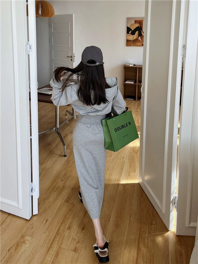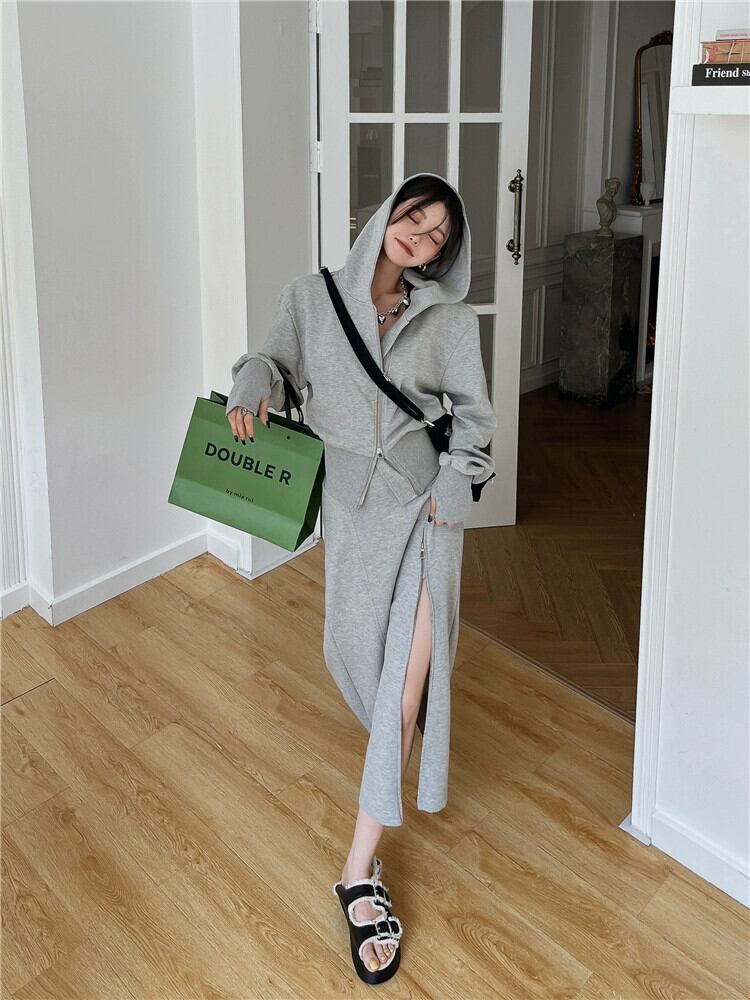 スーツグレートレーナーフード付きカーディガンコートハイウエストスリットスカート春の新作ツーピースセット女性 ハイウェスト スプリング 春物 nana55243328324