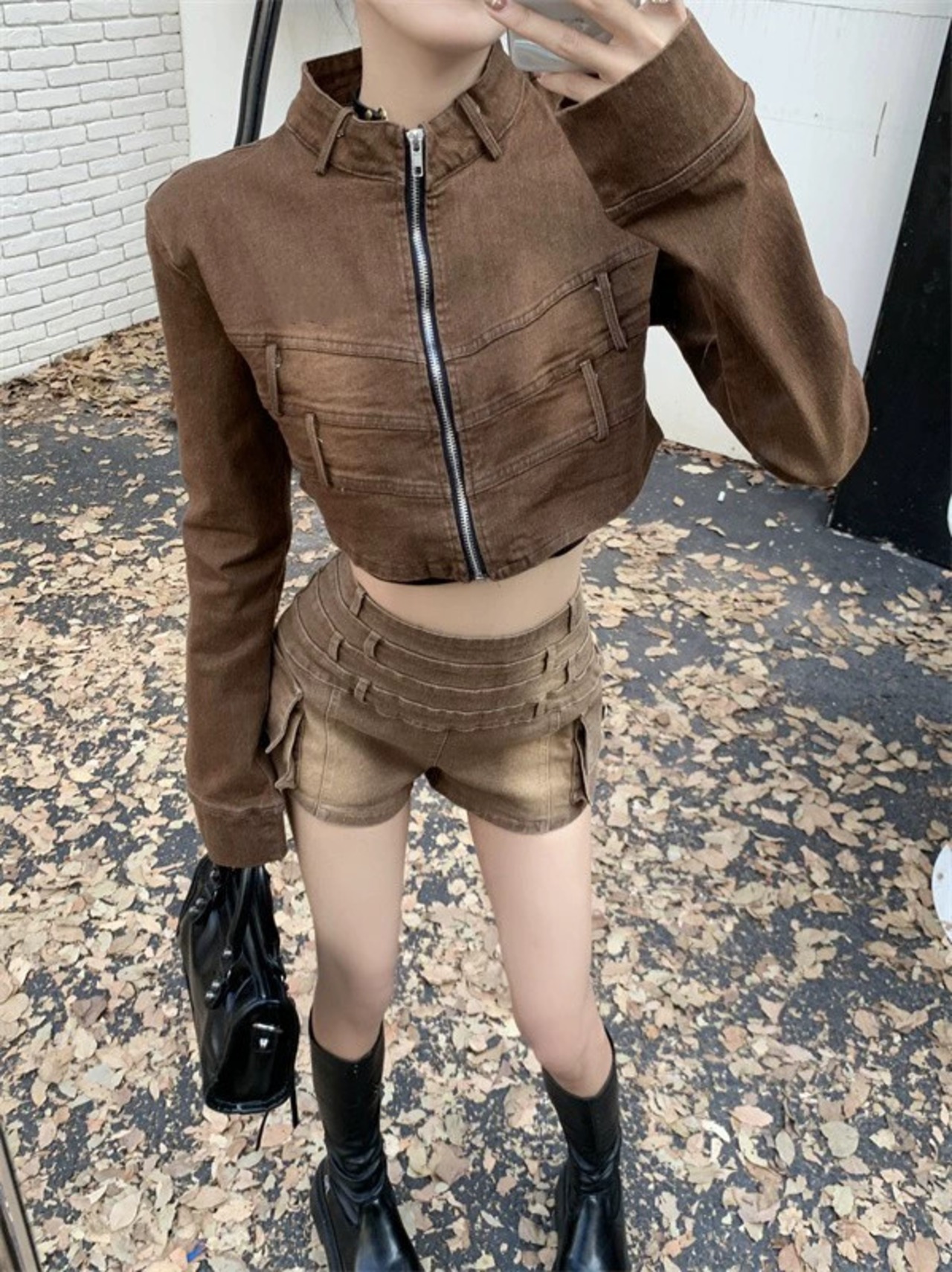 ナナ〜ブラウンカーディガンアメリカンレトロジッパーデニムショートジャケットハイウエストショートパンツ初春新作2点セットレディース ハイウェスト スプリング 春物 ショーツ ブルマー nana85383824088 | modepoisson