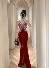 ニッチハイエンドサスペンダードレスレディース、フレンチスタイルベルベットロングスカート、イブニングドレス、誕生日スリットフィッシュテールスカート nana77203912713 | modepoisson