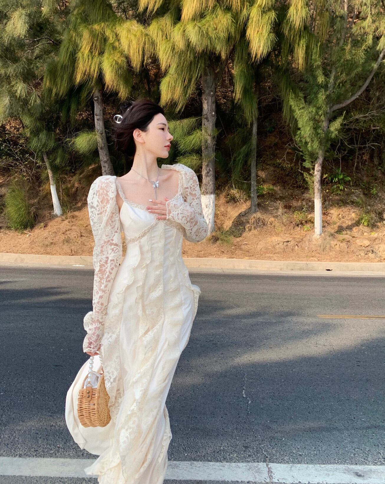 色:長袖日焼け止めブラウス,Vネックストラップレースドレス
