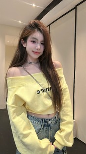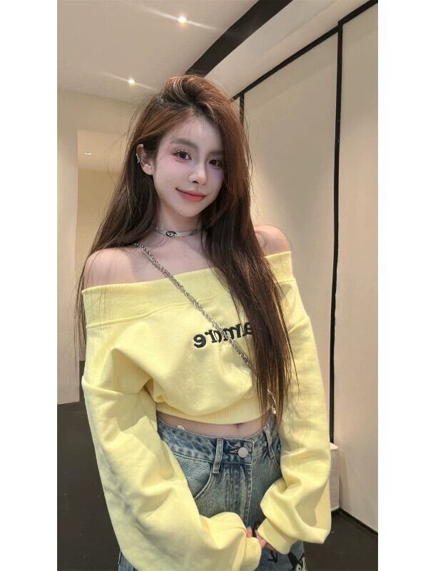 アメリカンレターワンショルダー長袖スウェットシャツ春の新スタイルニッチ甘辛オフショルダースリムショートトップ ロング 大人ガーリー スウィート キュート カジュアル スプリング 春物 nana19851876975 | modepoisson