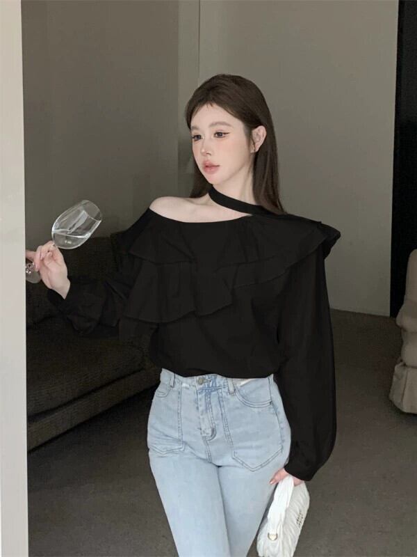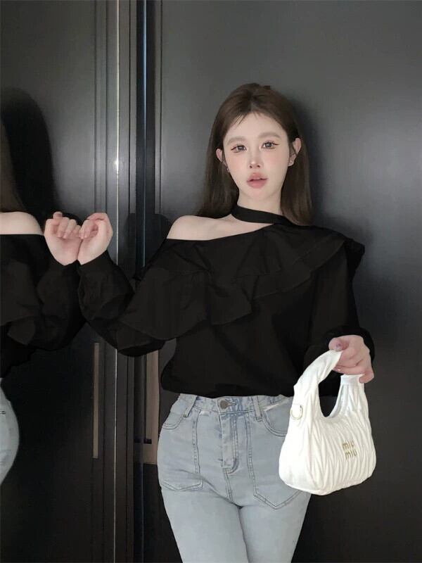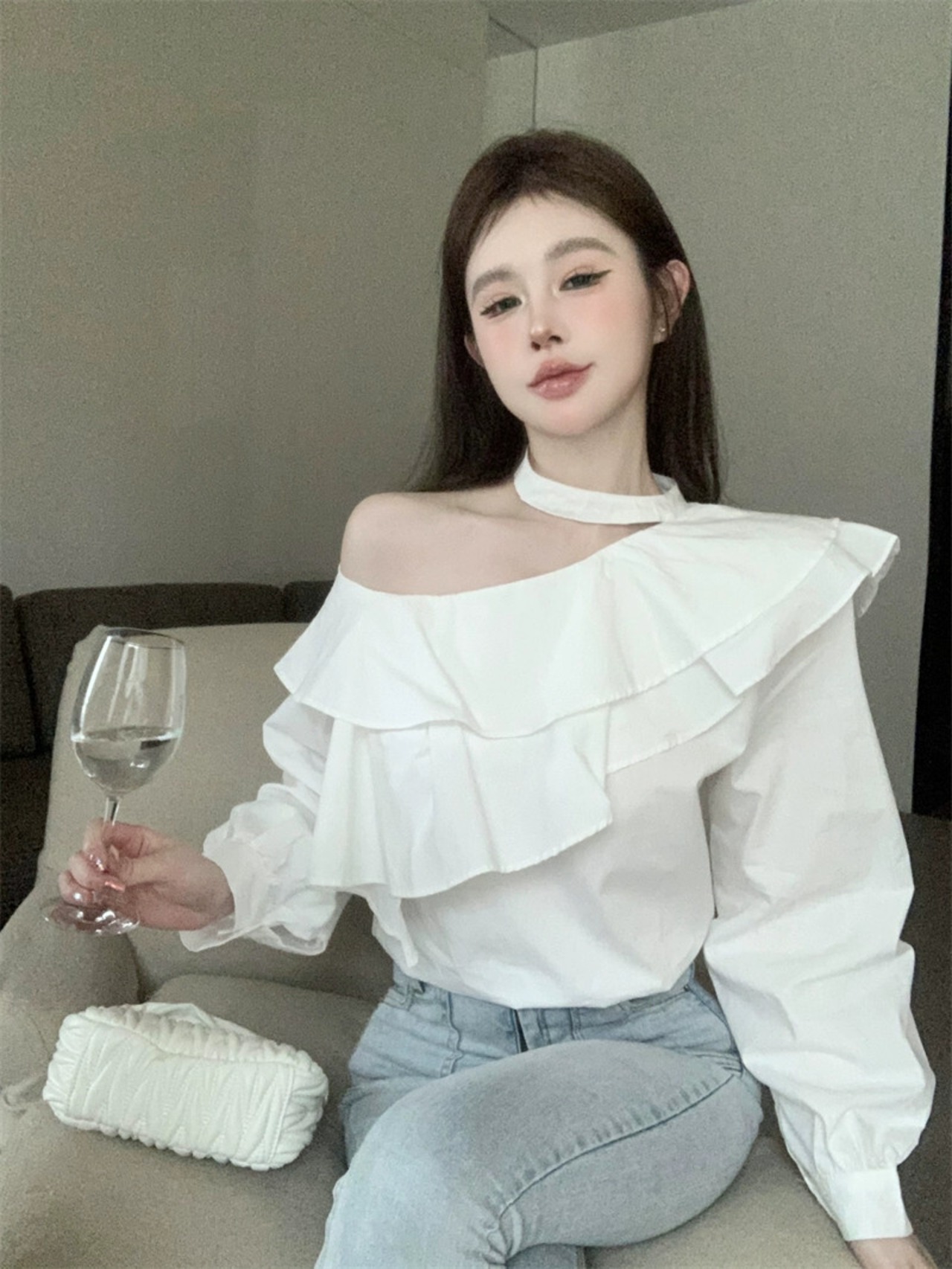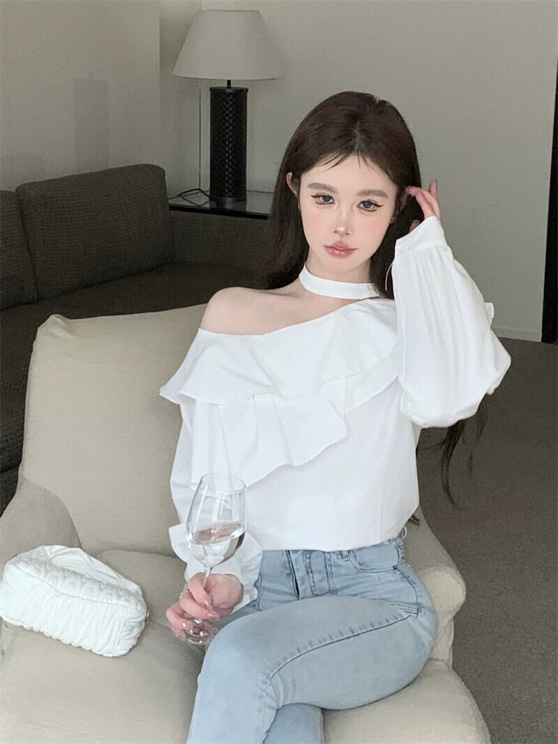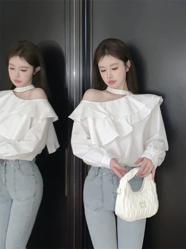 オフショルダーシャツ 2024 年初春の新しいスタイルのフリル白シフォンシャツ長袖トップ女性の美しくシックなシャツ ロング ホワイト スプリング 春物 nana82225740841 | modepoisson