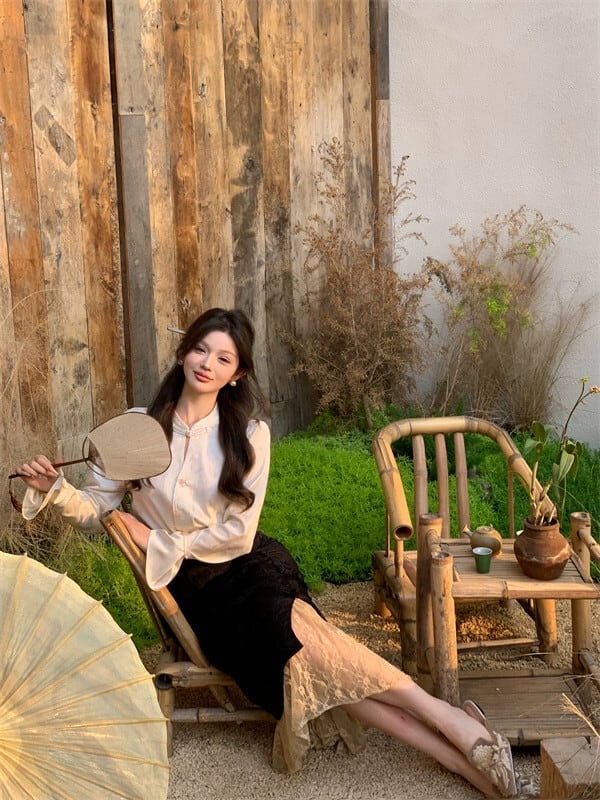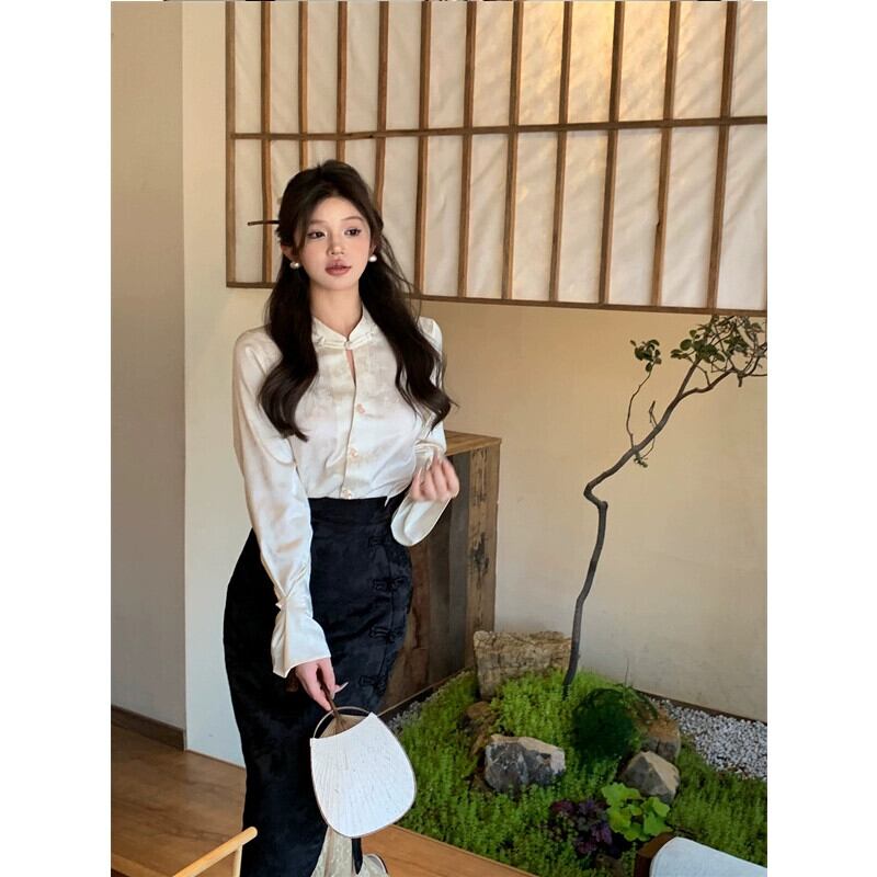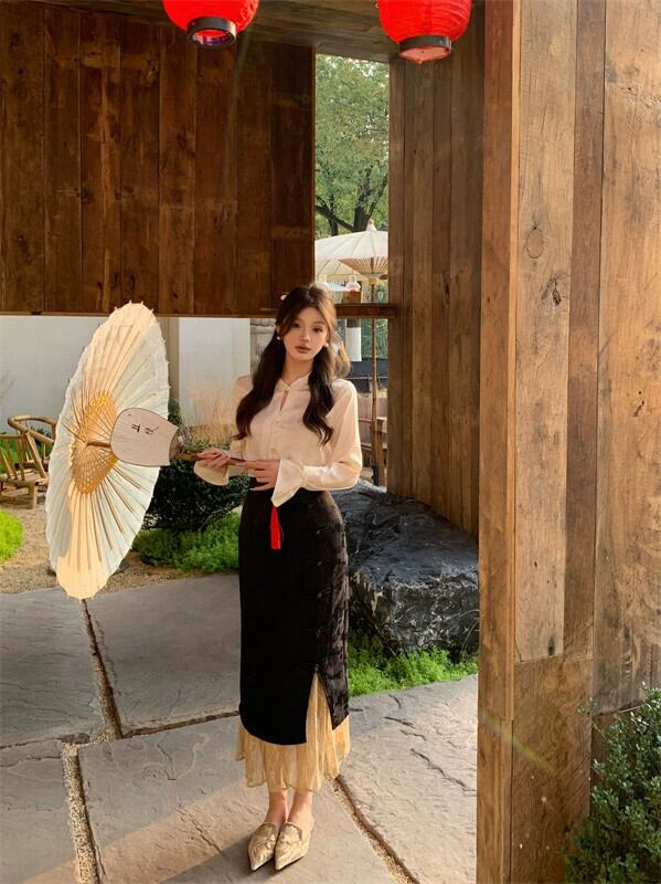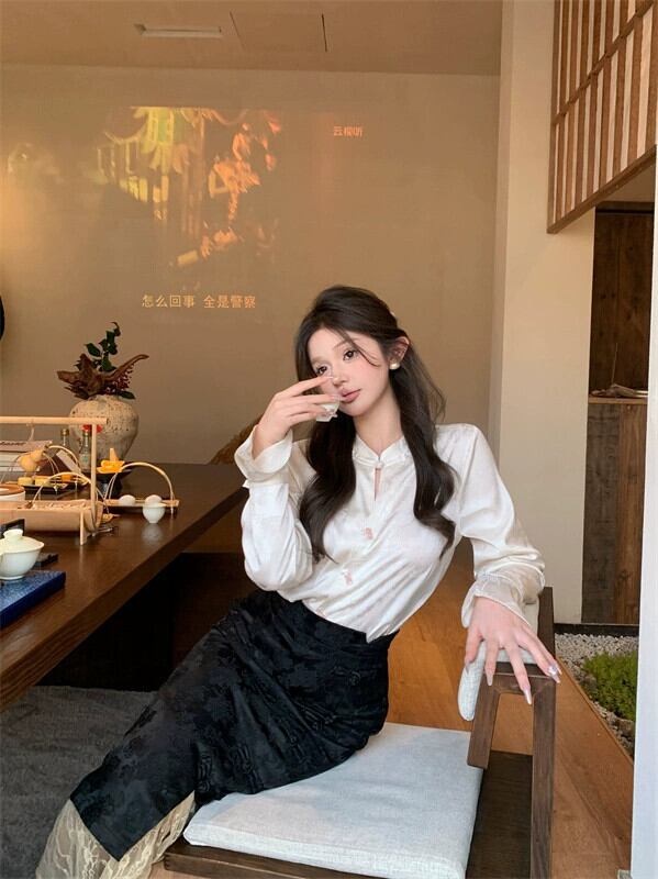 中国風のレトロなシャツの女性の春のスーツ甘くて痩身レースのスプライシングスカート 2 点セット 大人ガーリー スウィート キュート カジュアル スプリング 春物 nana71927341744 | modepoisson