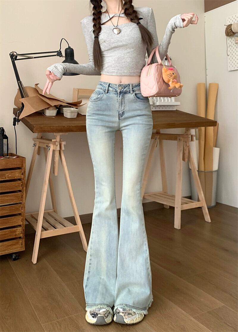 -ウエストパンツ、多用途、ハイウエスト、スリミング、ライトブルーウォッシュ、スリムフィット、切りっぱなしジーンズ、2024ファッショナブルジッパー nana84495565683 | modepoisson