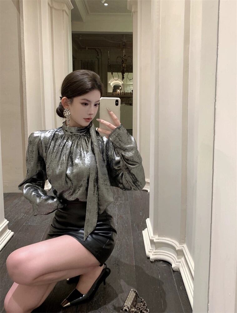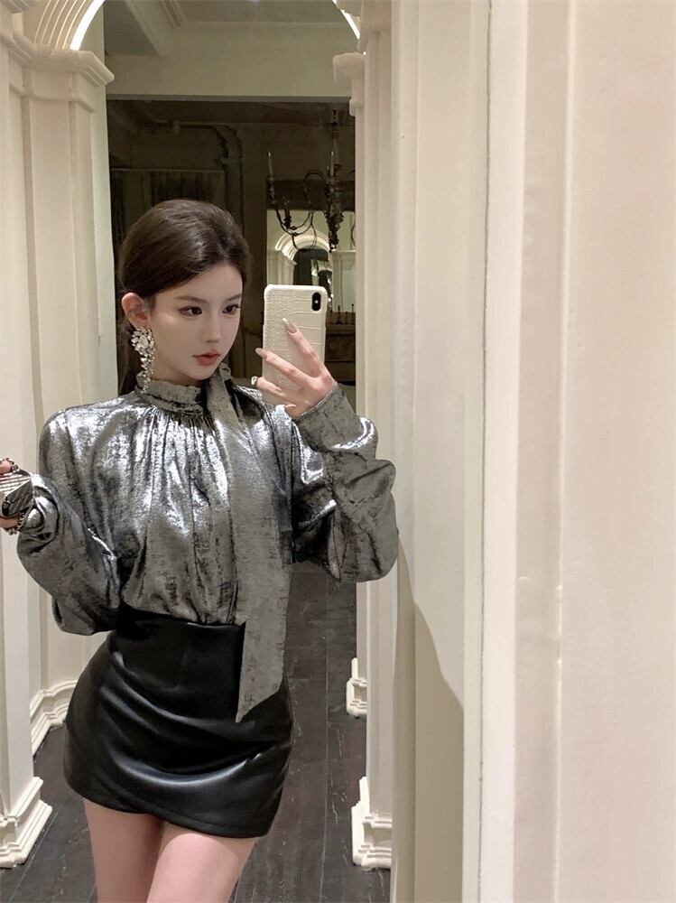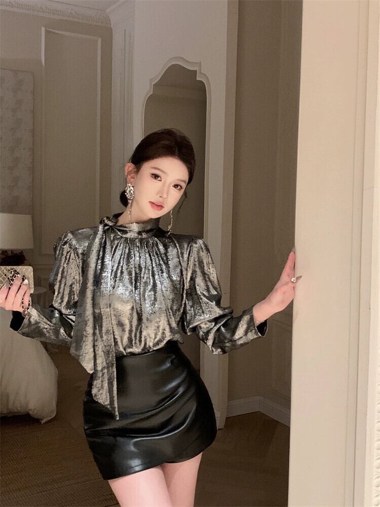 色:黒革のスカート,シルバーシャツ,ゴールドのシャツ