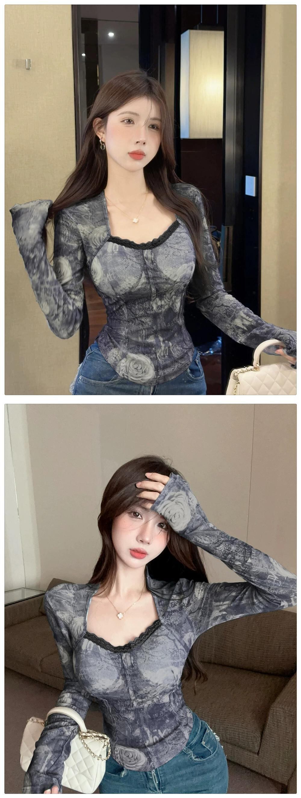 Sweet Spice Girl メッシュ長袖 Tシャツ レディース 春 レトロ インク プリント ショート スリム フィット ボトリング トップ ロング 大人ガーリー スウィート キュート カジュアル スプリング 春物 nana13389592077 | modepoisson