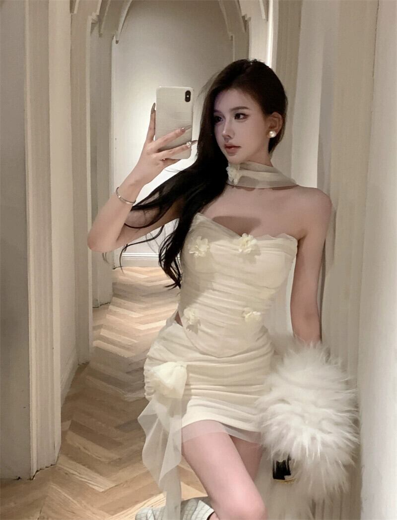 フレンチスタイルスーツメッシュスプライシングホルターネックチューブトップトップヒップカバーハーフスカート夏のツーピースセット女性 サマー 夏物 nana37378206998 | modepoisson