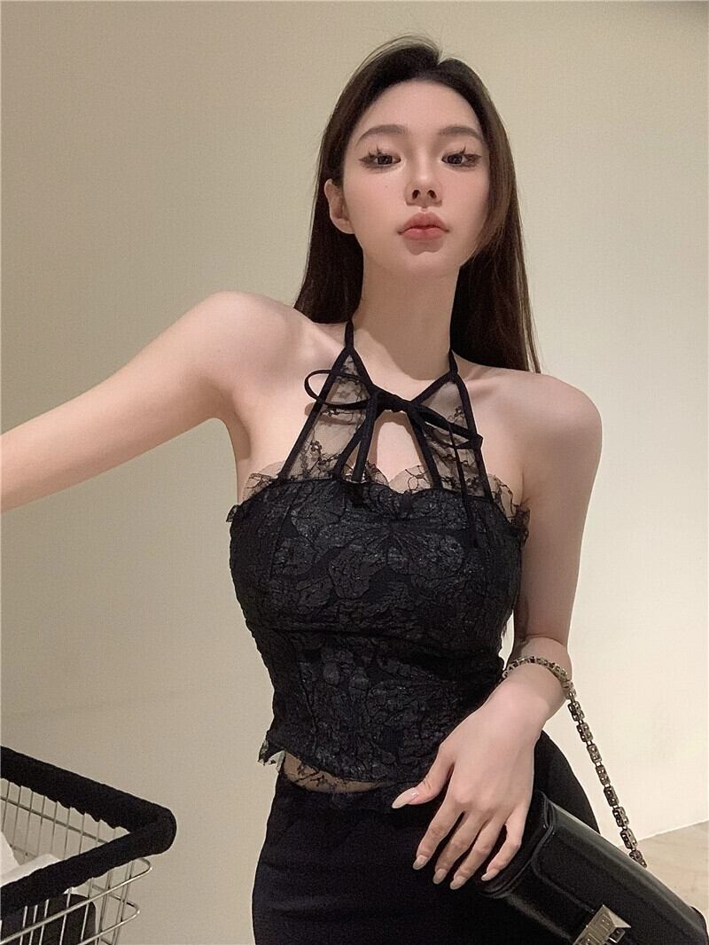 ホルターネックレースキャミソールレディースブラックスリムフィットハイエンドショートスタイルインナーレイヤリングシャツノースリーブトップ外着用 nana16538069012 | modepoisson