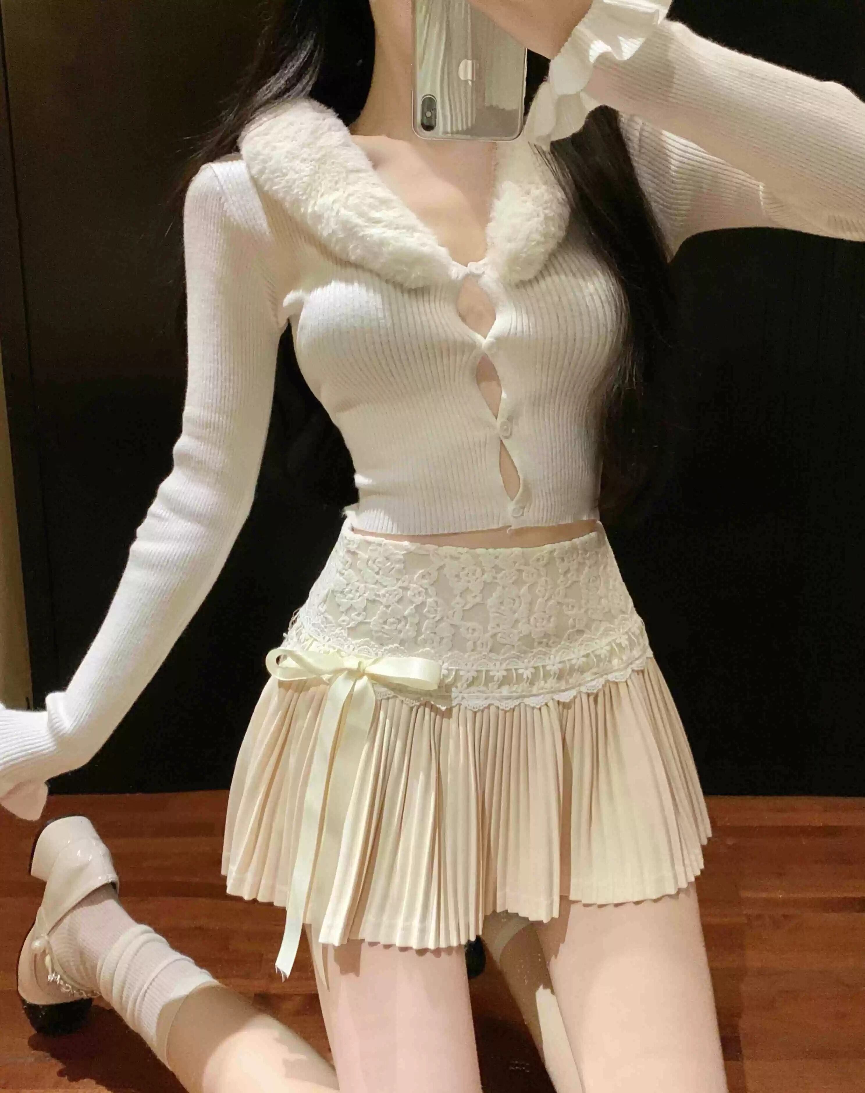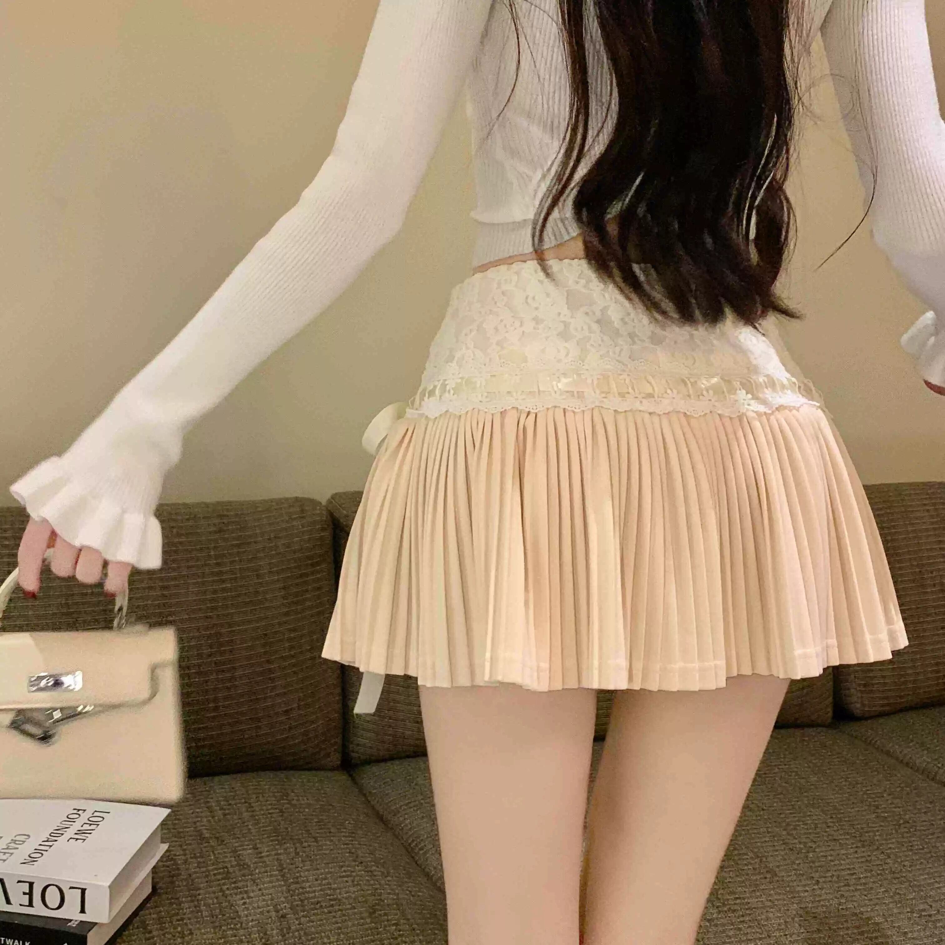 フレンチスタイルスカート新しいスタイルハイウエスト痩身Aラインショートスカート秋と冬のレーススプライシングプリーツスカート小さな女性 ハイウェスト オータム 秋物 ウィンター 冬物 nana2260428023 | modepoisson