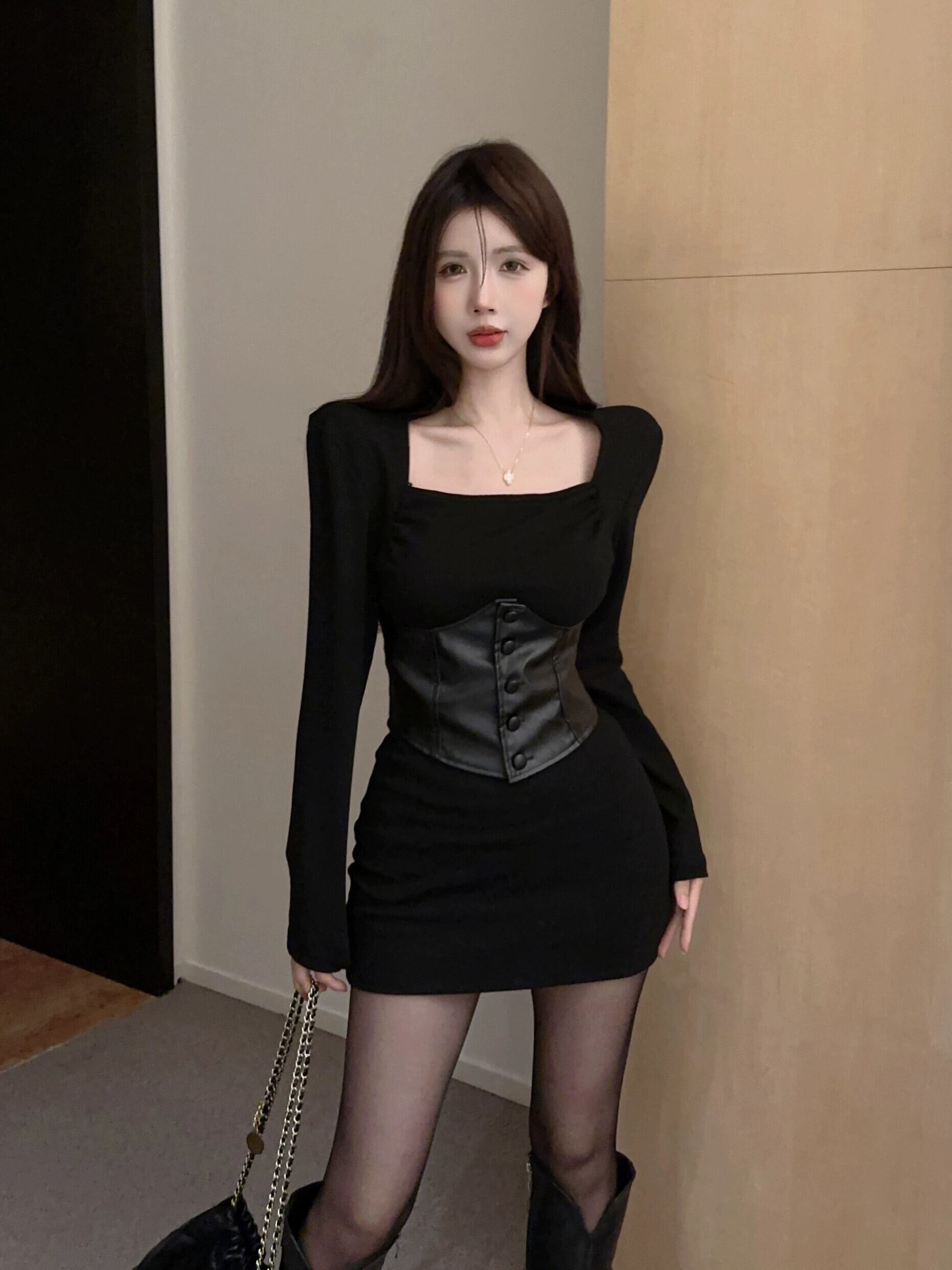 秋と冬のボトリングドレスセクシーなスクエアネックウエスト純粋な欲望ヒップスカートスリムスリム黒ショートスカート女性 ブラック オータム 秋物 ウィンター 冬物 ピュア スクウェア nana48662876661 | modepoisson