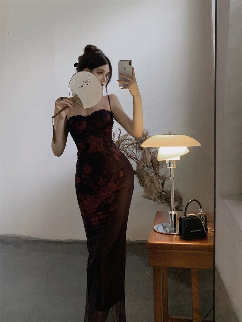 フランスの気質のドレス女性、紫色のプリントデザイン、秋の新しいスタイルのサスペンダーバッグヒップスリットロングスカート オータム 秋物 パープル nana59676567725 | modepoisson
