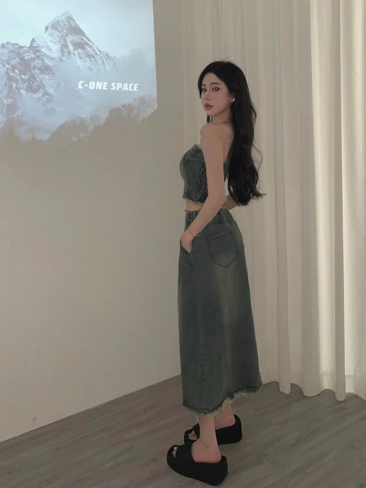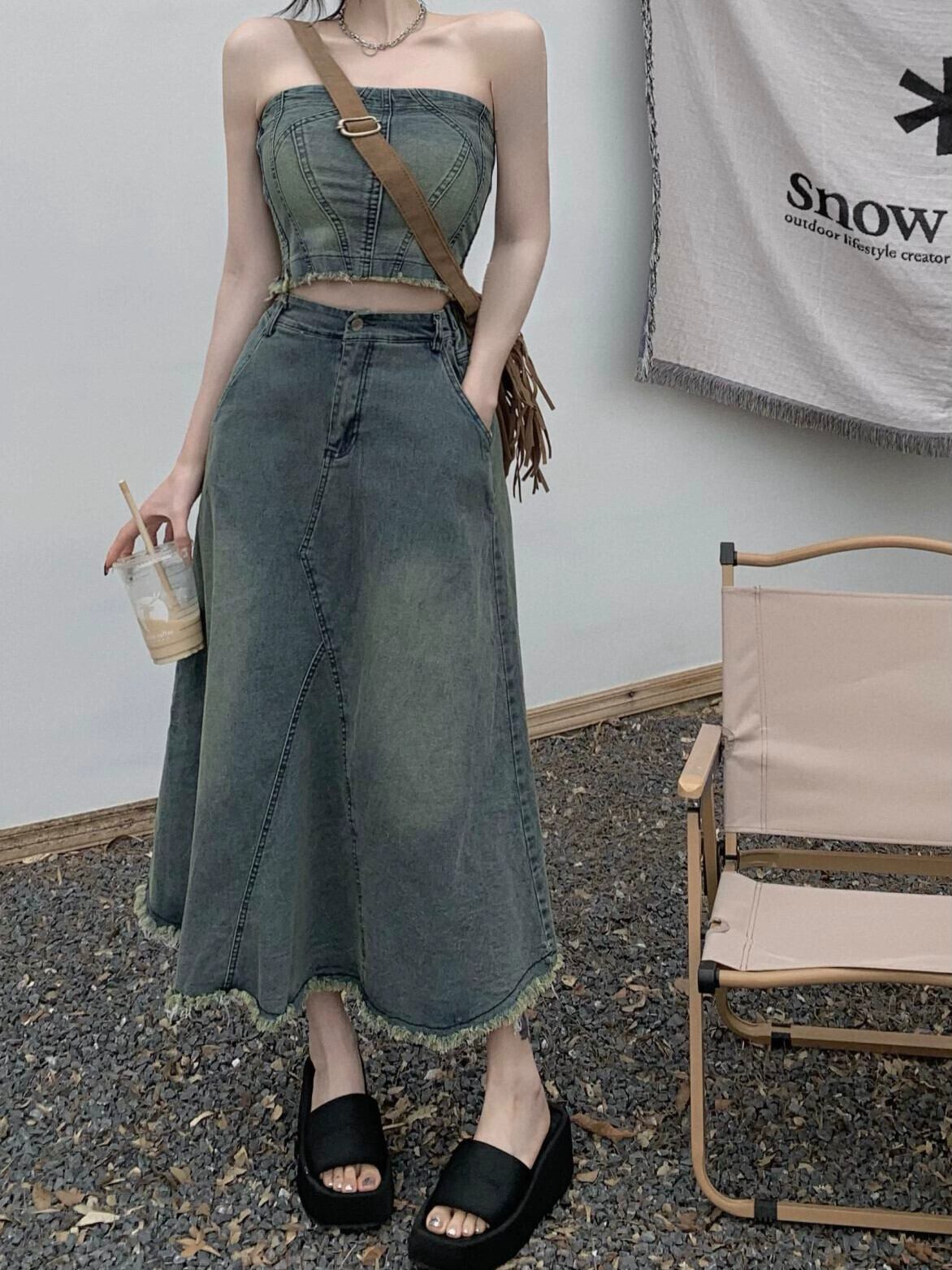 ナナ ~ 純粋な欲望スタイルのレトロなチューブトップ デニム トップとハイウエストとワイド スカートのファッショナブルな 2 点セット女性の春 ハイウェスト スプリング 春物 ピュア nana11250166265 | modepoisson