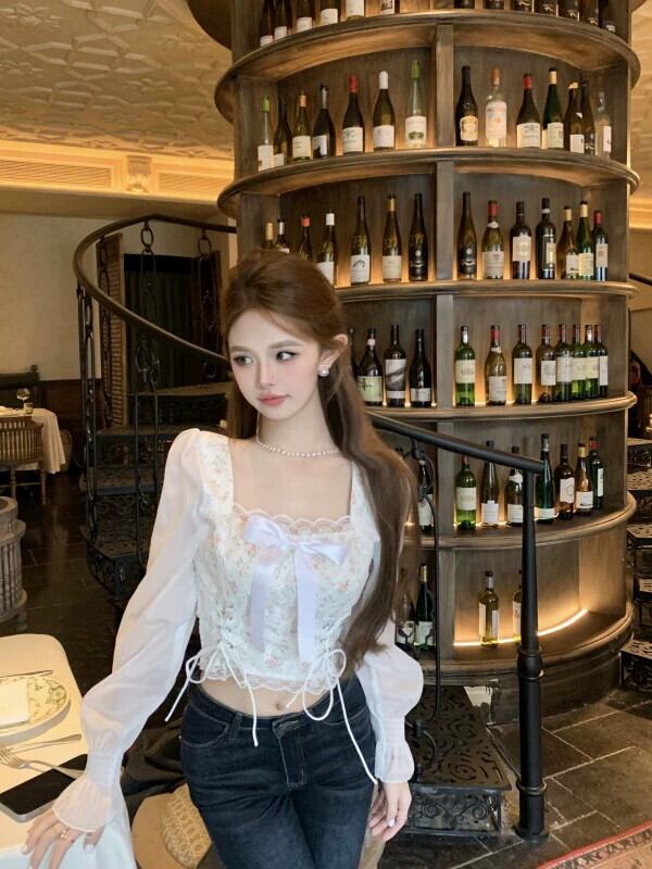 Nana~純粋な欲望、注意、シックなレーススクエアネック巾着シャツ、春のホットガールスタイルスリムショートトップレディース スプリング 春物 スクウェア nana5710145731 | modepoisson