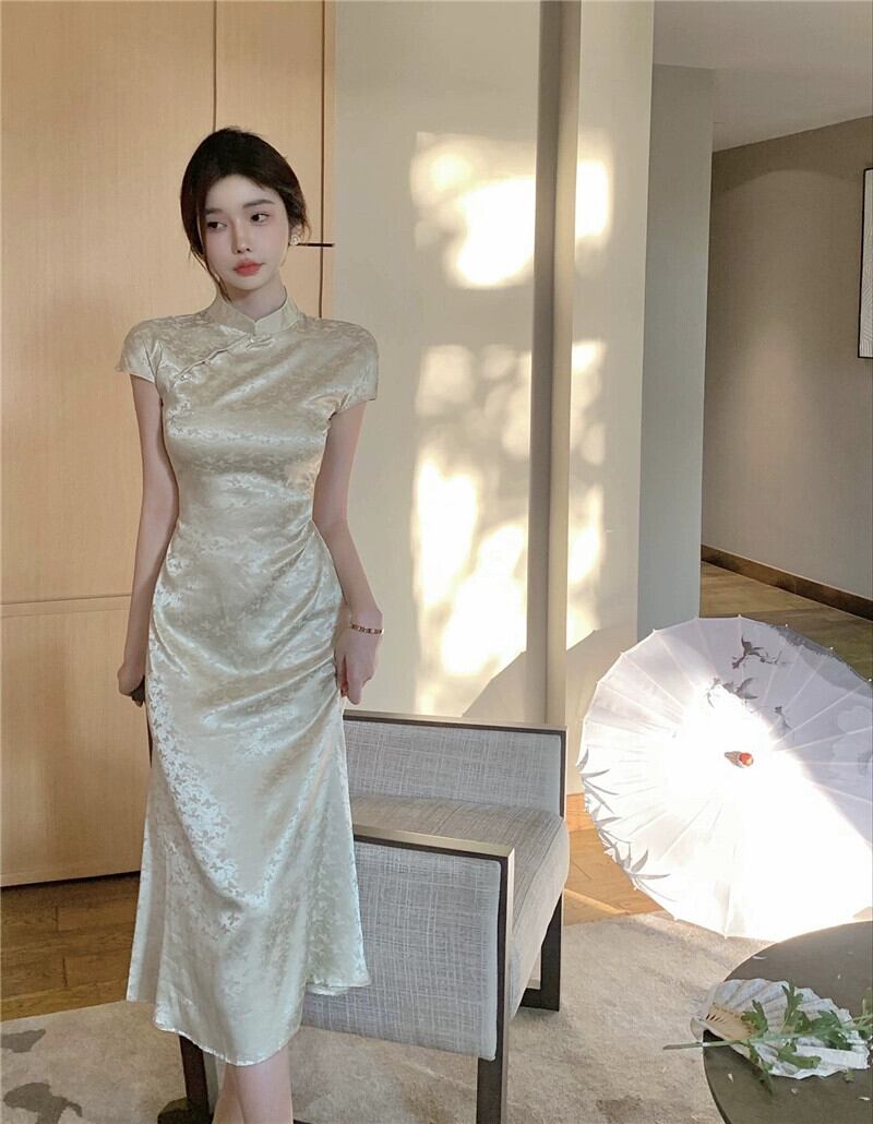 アメリカのサテンジャカード改良されたチャイナドレスの女性の夏の新しいスタイルのレトロな国家スタイルの新しい中国風の半袖ドレスロングスタイルの女性 サマー 夏物 nana35674007732 | modepoisson