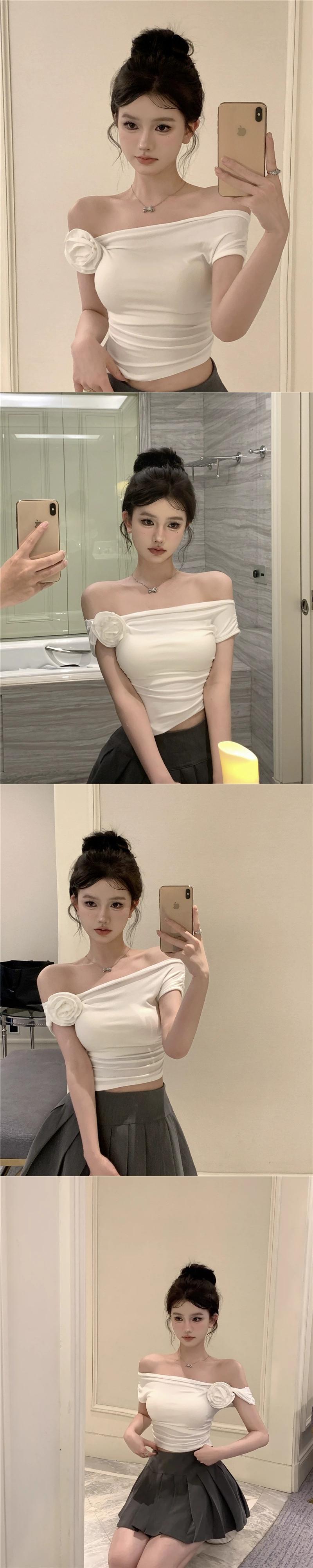タイトなセクシーなネクタイ半袖 Tシャツ女性の夏フレンチ立体フラワーワンショルダーブルーニッチショートトップ サマー 夏物 フラワーデザイン nana58247256719 | modepoisson