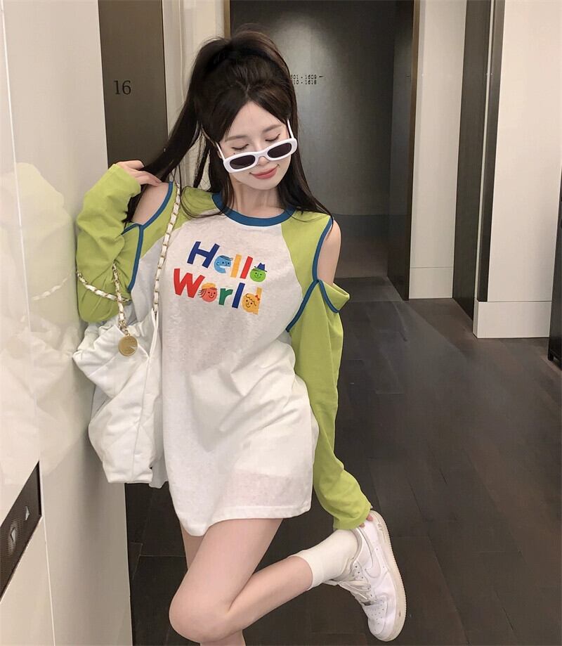 ゆったりとしたコントラストカラーのプリントオフショルダー長袖薄手Tシャツレディース春デザインニッチエアコンシャツ日焼け止めトップ ロング スプリング 春物 nana22665576458 | modepoisson