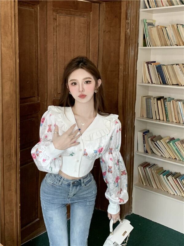 フレンチデザイン長袖シャツレディースニッチ甘い花柄ショートスタイルスリムフィットドールカラー新しいトップ ロング 大人ガーリー スウィート キュート カジュアル nana79320741556 | modepoisson
