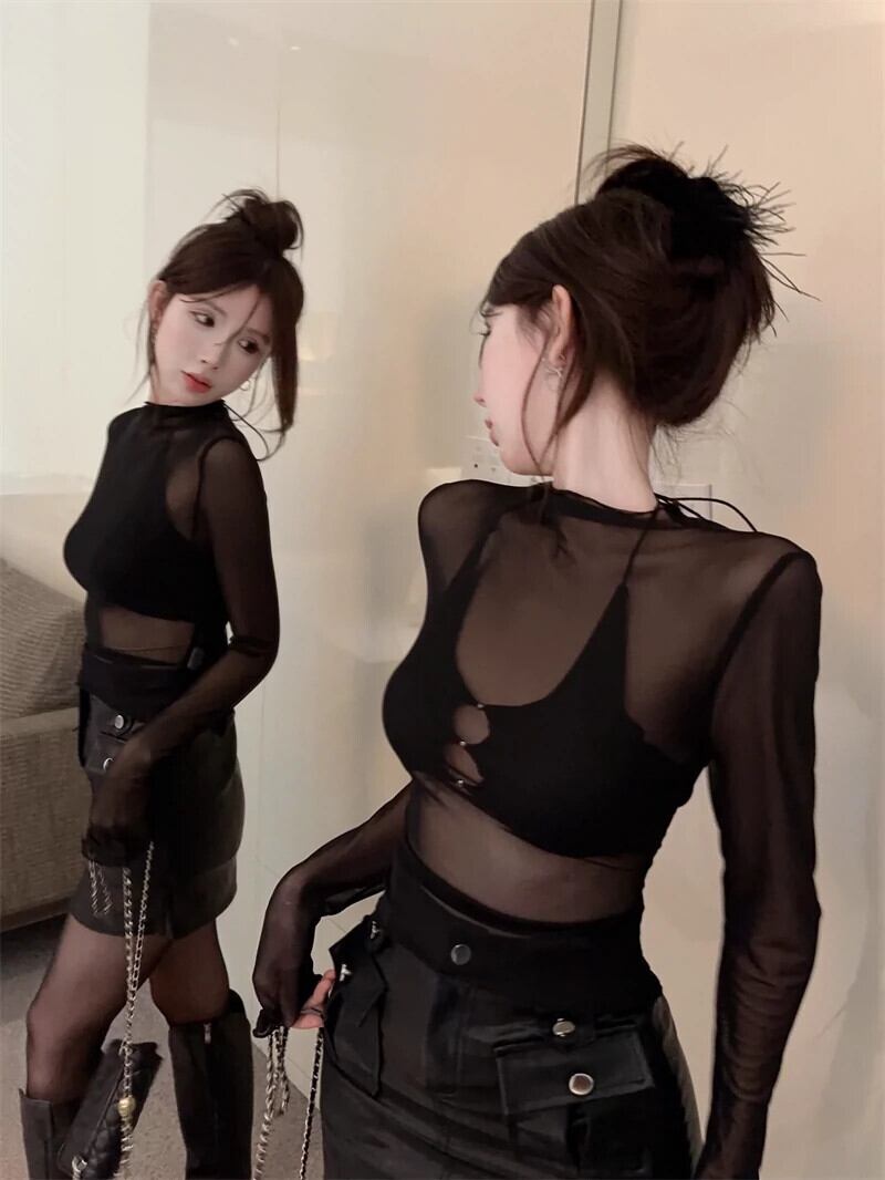 甘辛スリムTシャツ Pure Desire セクシー中空キャミソール シースルーメッシュ長袖トップス レディース 2点セット ロング 大人ガーリー スウィート キュート カジュアル ピュア nana38973078348 | modepoisson
