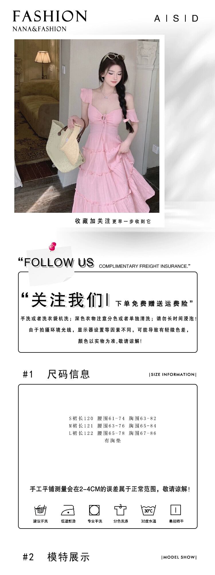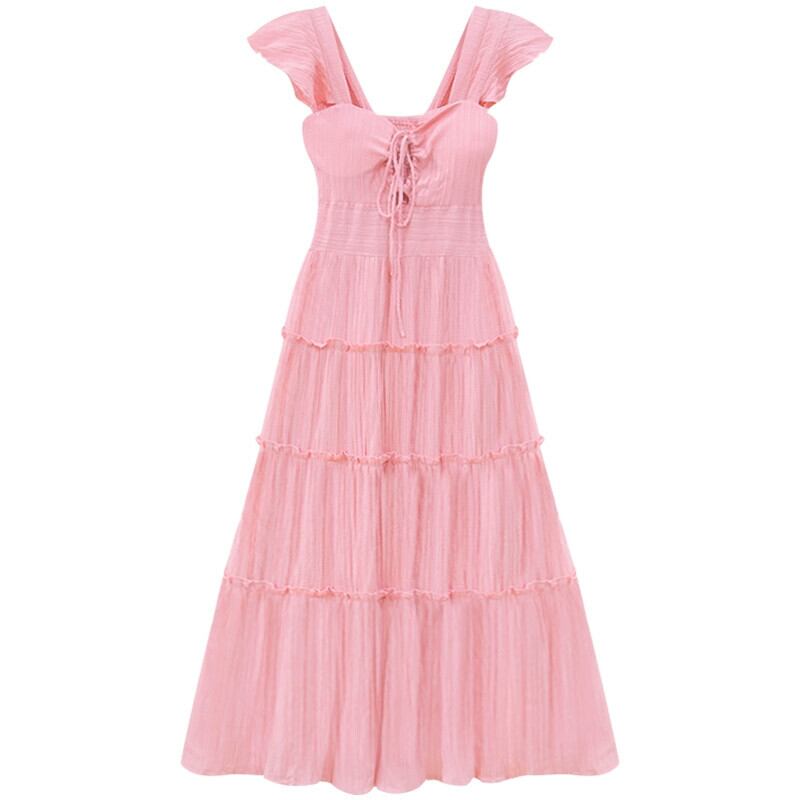 初秋のピンクの小さなフライングスリーブドレスの女性、優しいスカート、プリーツレースアップウエスト、エレガントで高級なAラインロングスカート オータム 秋物 nana72926566710 | modepoisson
