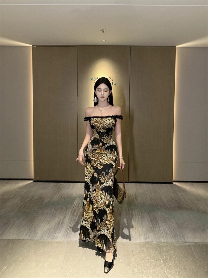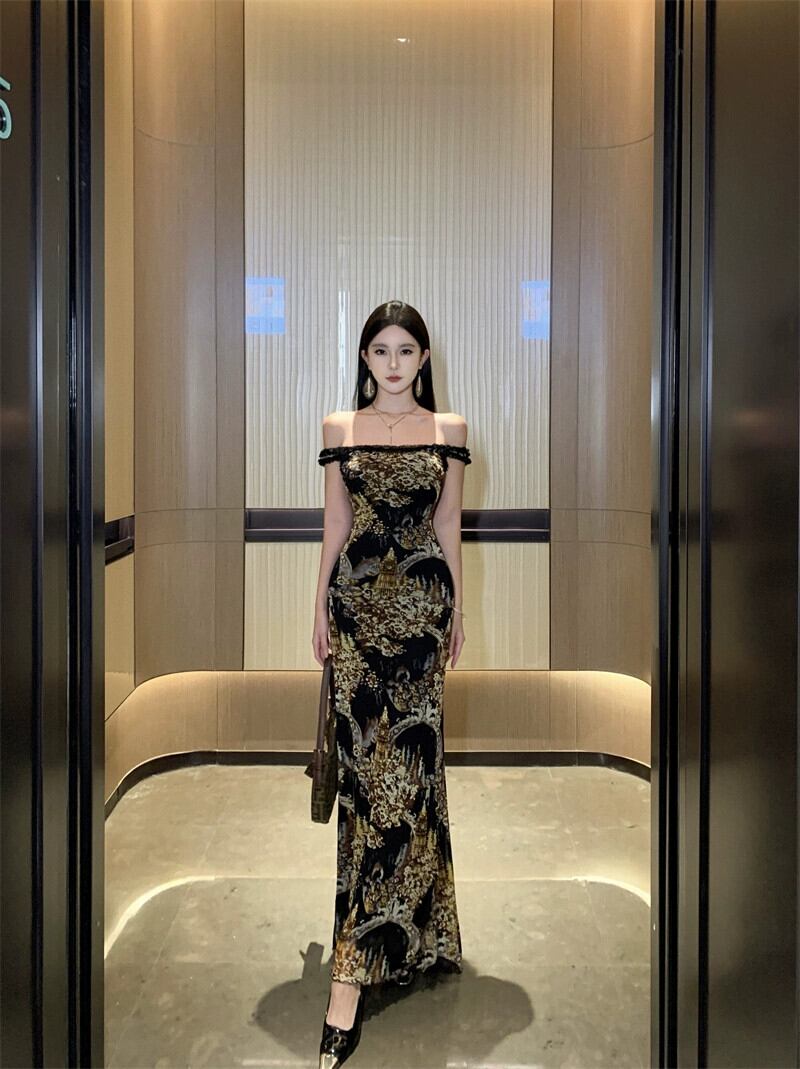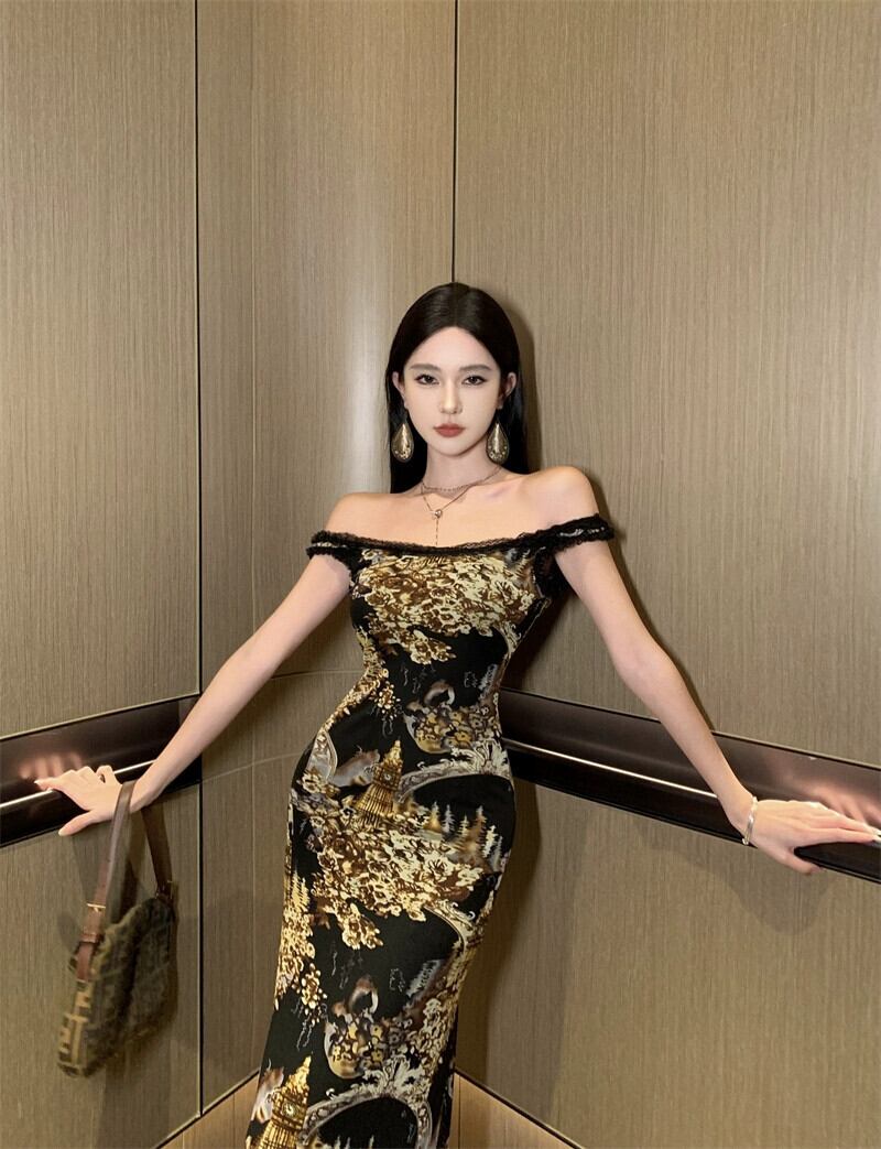 ワンショルダーのウエストを締める気質ドレスの女性の秋と冬の新しいスリムフィットスカートレトロレースフィッシュテールロングスカート オータム 秋物 ウィンター 冬物 nana49782967276 | modepoisson