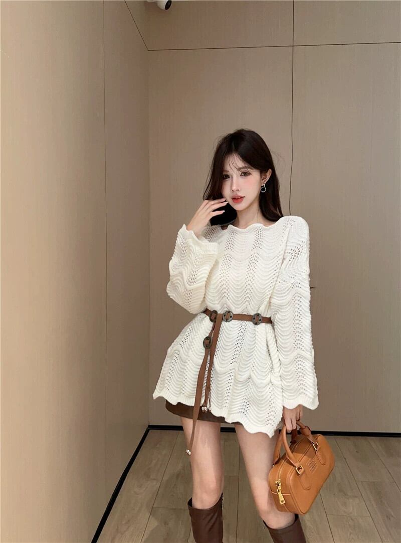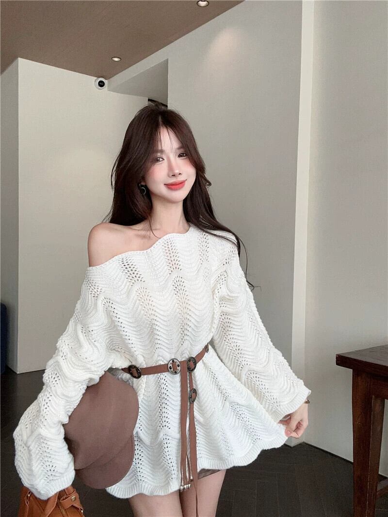 怠惰なスタイル中空オフショルダー白セーター女性春と秋 2024 新しいスタイルミッドレングスルーズセータートップ ホワイト スプリング 春物 オータム 秋物 nana52555321695 | modepoisson