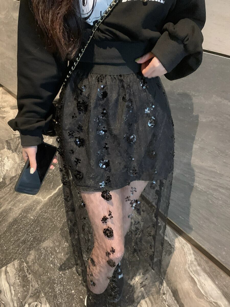 ed レーススカートハイウエスト痩身黒メッシュミッドレングス a ラインスカート女性の夏の 2024 新しいスタイル ハイウェスト ブラック サマー 夏物 Aライン nana12381787733 | modepoisson