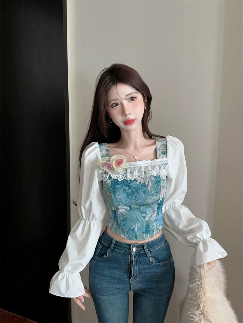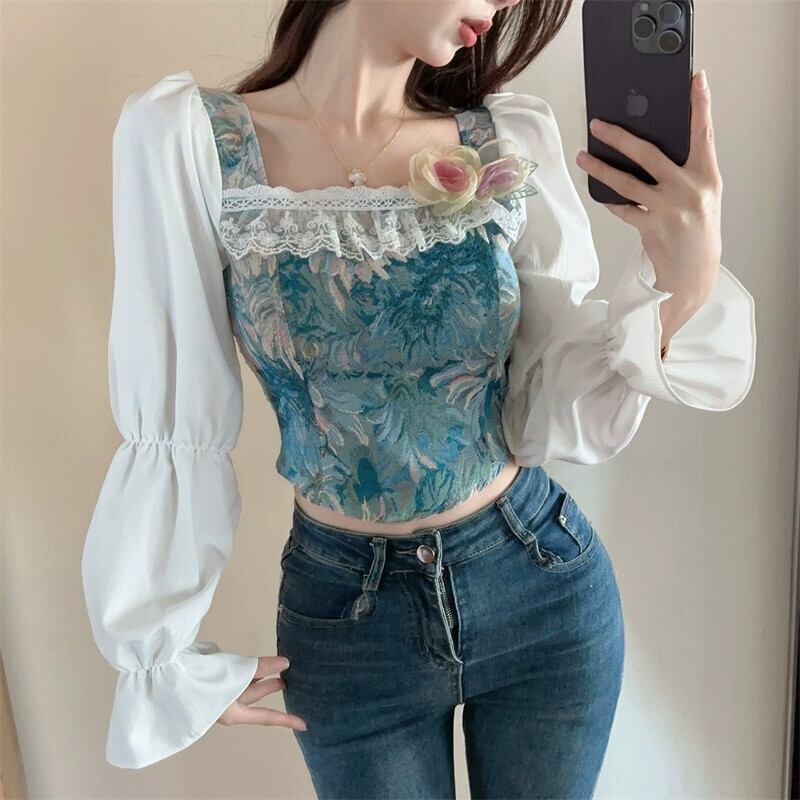 アメリカ版 2024 春と秋のフランスのレトロな気質ランタン長袖スクエアカラーパフスリーブプルオーバージャカードシャツ女性 ロング スプリング 春物 オータム 秋物 スクウェア nana1934135889 | modepoisson