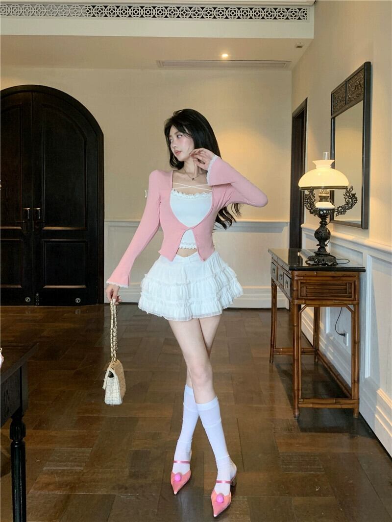 フェイクツーピースレーストップ甘いネクタイスリムフィットスーツ女性の 2024 年春の新しいスタイルのふわふわ A ラインスカート 大人ガーリー スウィート キュート カジュアル スプリング 春物 Aライン nana89773966012 | modepoisson